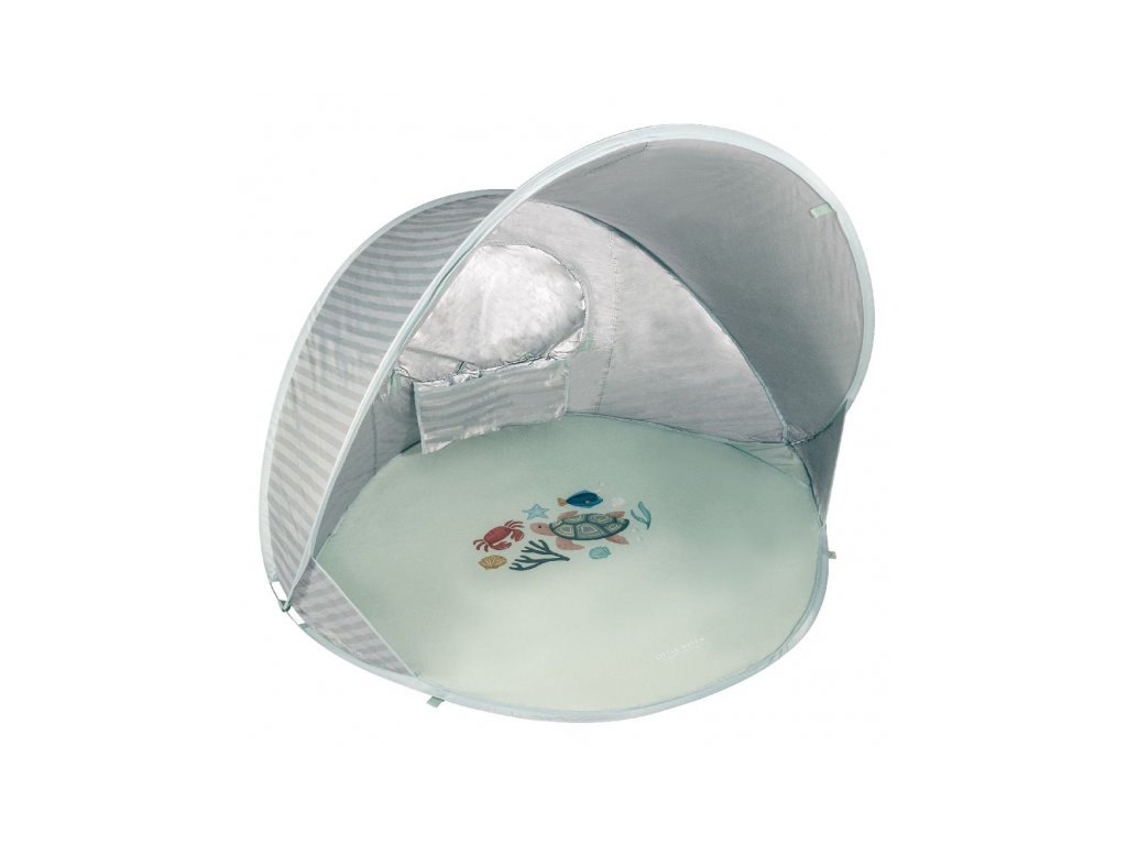 Přenosný skládací stan s UV faktorem 40+ pro ochranu dítěte před sluncem na zahradě, na pláži či na výletech do přírody. Stan umožňuje snadnou ventilaci díky zadnímu okénku na zip. Dvě kapsy na vnitřní stěně nabízí prostor pro uložení drobností.