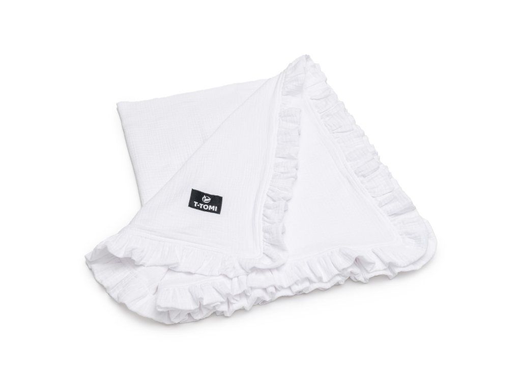 Čo keby ste si namiesto tradičnej deky alebo prikrývky zaobstarali našu mušelínovú deku T-TOMI s volánom? Luxusný mušelín je v súčasnosti veľmi obľúbeným materiálom a niet divu. Vďaka svojim skvelým vlastnostiam je to materiál číslo jeden pre bábätká. Mušelínovú deku T-TOMI s volánom môžete používať nielen v postieľke, ale aj v kočíku, kde zaručene upúta pozornosť na všetkých prechádzkach, alebo doma, napríklad v mojžišovom košu.V kombinácii s dizajnovým partnerským mušelínovým vankúšom T-TOMI získate krásnu postieľku pre vašich najmenších.