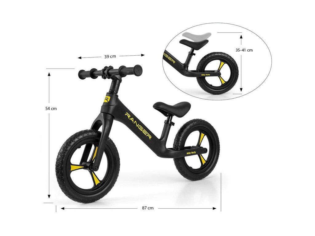 Odolná a vyrobená najnovšou technológiou EVA peny, 12" kolesá odolné proti prepichnutiu, ktoré nie je potrebné nafukovať, sú bezúdržbové. Ergonomické, výškovo nastaviteľné sedlo s mäkkou výplňou zaisťuje dieťaťu pohodlie pri jazde a rastie s dieťaťom. Kolo Ranger má riadidlá v guličkových ložiskách, rovnako kolesá s guličkovými ložiskami.Protišmykové rukoväte z mäkkej gumy zaisťujú pevné uchopenie a pohodlné vedenie.