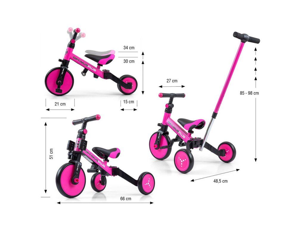 Detská trojkolka 4v1 Milly Mally Optimus Plus s vodiacou tyčou pink - 54420