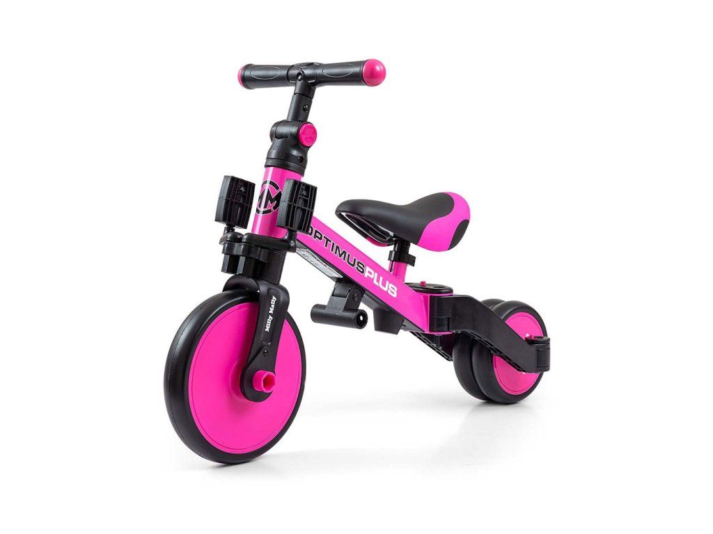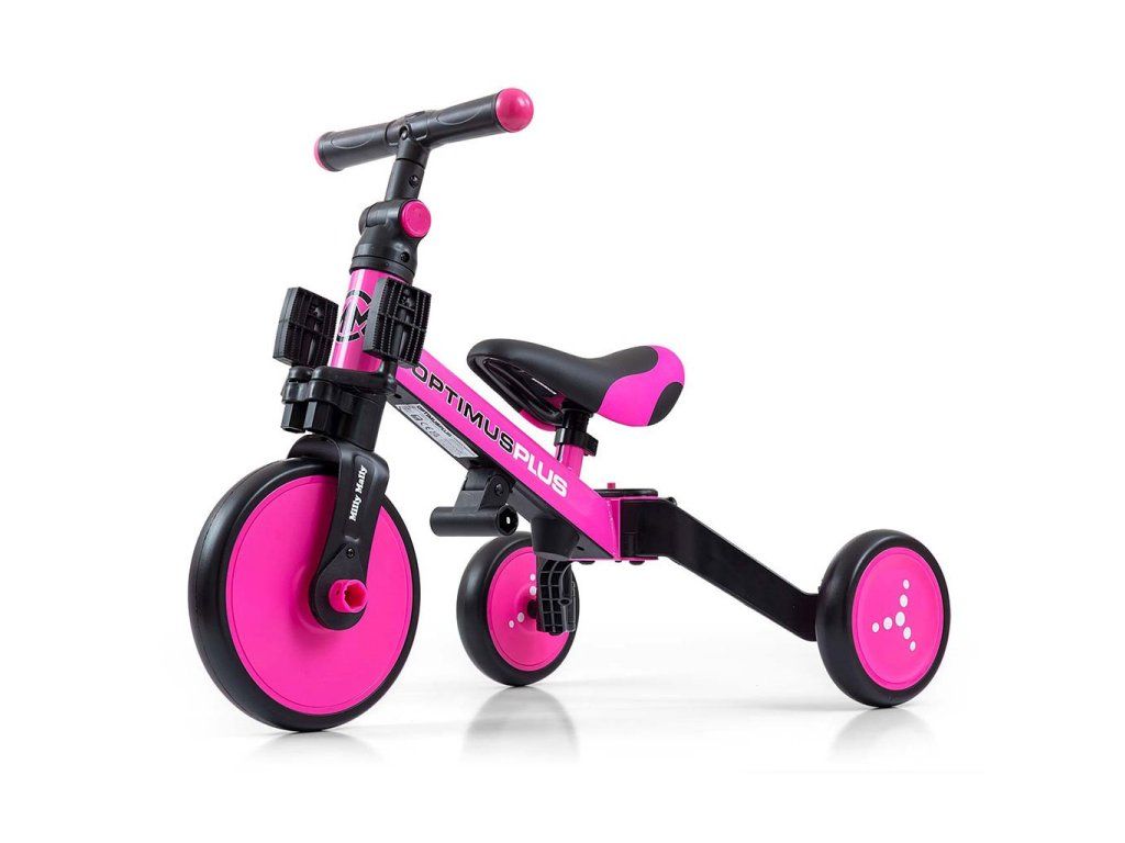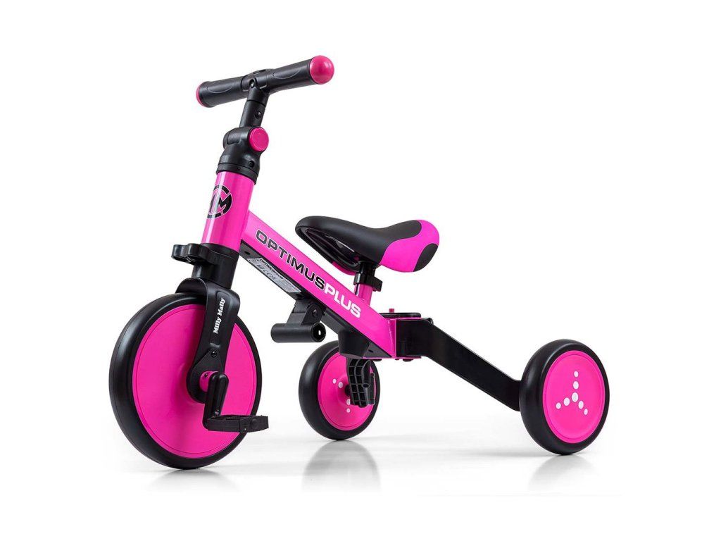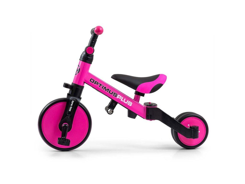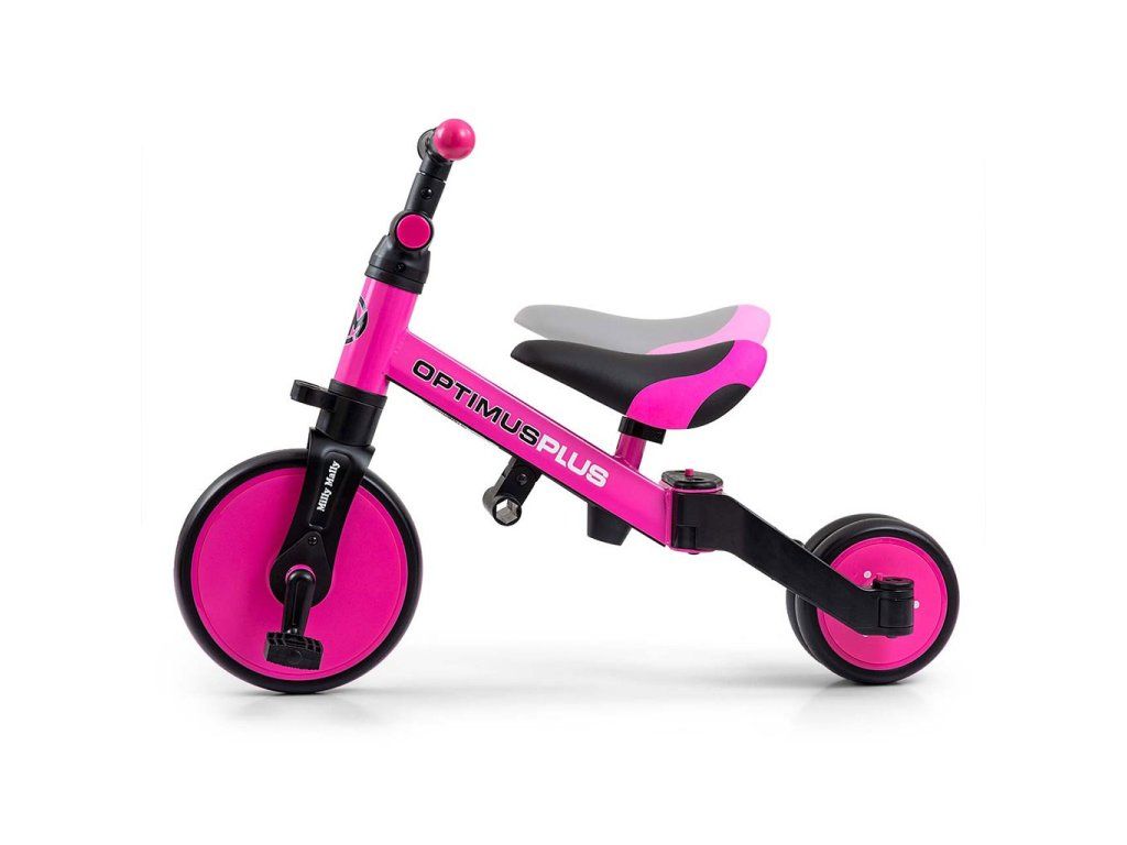 Univerzálna detská šliapacia trojkolka Milly Mally 4v1 Optimus bola navrhnutá tak, aby sa stala tým najlepším čo môžete ponúknuť svojmu malému pretekárovi. Vďaka stabilnej konštrukcii poskytuje dieťaťu maximálnu úroveň bezpečnosti a týmto mu uľahčuje získavanie nových zručností. Najväčšou výhodou tejto trojkolky je jej variabilita. Akonáhle dieťa získa základy jazdy, pripojíme pedále, alebo ju počas okamihu zmeníme na klasické jednostopové odrážadlo. Penové kolesá výborne absorbujú nárazy, poskytujú dobrú priľnavosť, zaistia pohodlie počas jazdy a neunavia vášho malého pretekára. Dostatočná vzdialenosť kolies medzi sebou poskytuje mimoriadnu stabilitu, bezpečnosť počas používania doma i vonku. Doraz nedovolí pretočenie riadidiel.