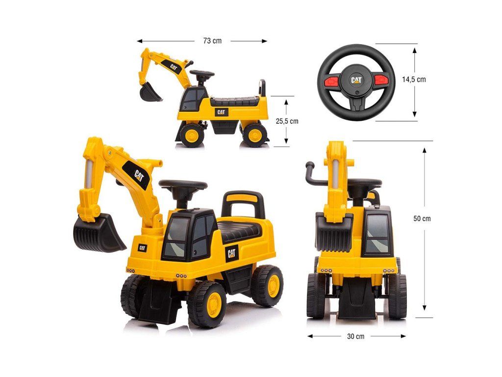 Licencovaný CAT Excavator ride-on je odrážadlo, pri ktorého výrobe bola venovaná pozornosť aj tým najmenším detailom a kvalite použitých materiálov. Každého malého fanúšika "bagristu" poteší možnosť ovládať "rameno" a "lyžicu" bagru, rovnako ako intuitívny volant s realistickými zvukmi klaksónu a štartovanie motora.