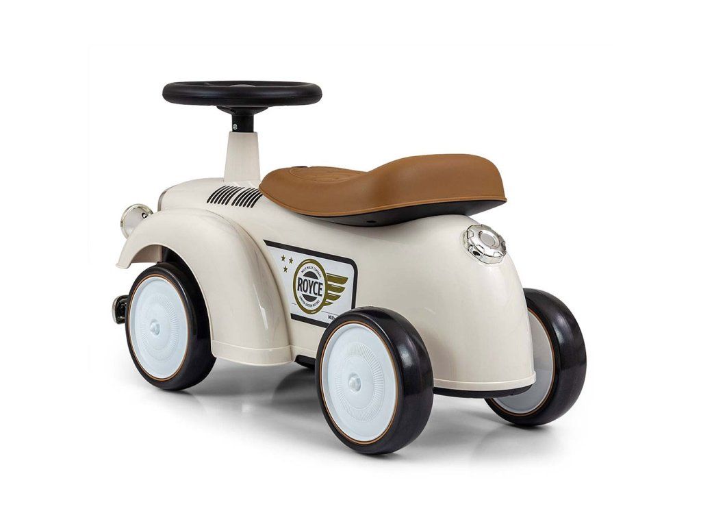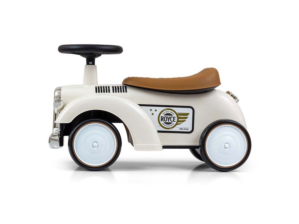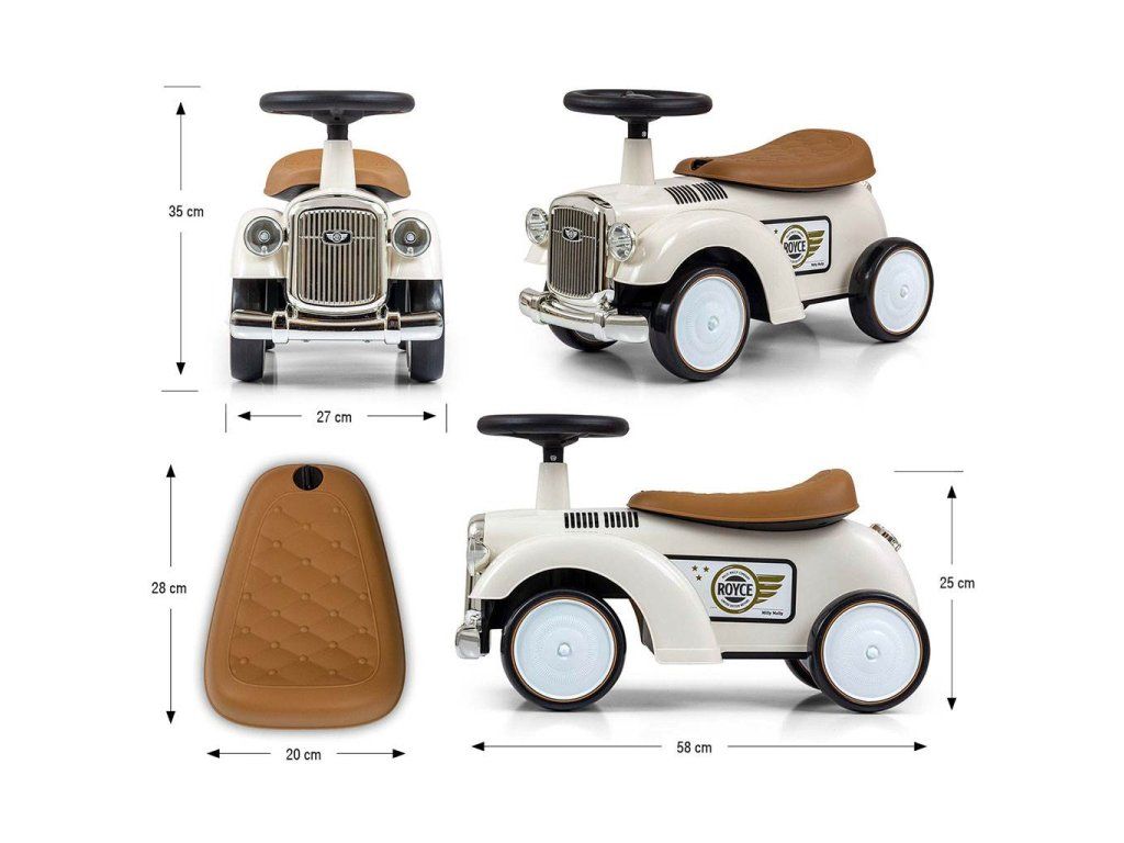 Vintige Royce Milly Mally zve malých cestovateľov na retro jazdu. Upúta pozornosť svojimi oku lahodiacimi farbami. Je bohato vybavený. Toto autíčko má volant so zvukom a tvarované sedadlo. Poskytne vášmu dieťaťu skvelú zábavu pri riadení a rozvíja jeho zmysl pre rovnováhu a všeobecné motorické schopnosti. Autíčko má ľahkú plastovú konštrukciu a ergonomické tvary. Otočný volant nášho jazdca Royce umožňuje náročné manévry doma aj na prechádzkach. Kolesá tohto krásneho vozidla sú vyrobené z mäkkej EVA peny. Retro autíčko môže vaše dieťa používať ako svoje prvé vozidlo so skutočným volantom a klaksónom, ako aj ako kočár s otvoreným úložným priestorom na hračky (malý kufor), imitáciou palivovej nádrže na zadnej časti vozidla a prednou časťou vozidla – mriežkou v striebornej farbe. Logo ROYCE dodáva tomuto vozidlu estetiku a prestíž. Poslednou tečkou za modelom Royce je jeho darčeková krabička, ktorá si zachováva charakter retro vozidiel z počiatkov automobilového priemyslu. Royce je určený pre všetky deti, ktoré dokážu samostatne sedieť. Odrážadlo sa dá používať v interiéri aj exteriéri a spríjemní vášmu dieťaťu čas strávený na prechádzkach.