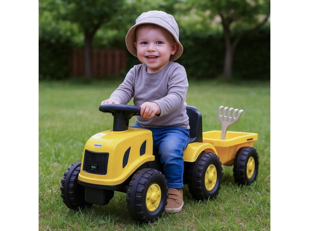 Malí farmári si prídu na svoje! Žltý traktor Baby Mix Benny s vlečkou a náradím sa rýchlo stane obľúbenou hračkou každého dieťaťa. Vďaka pevným kolesám, pohodlnému sedadlu a odnímateľnej vlečke sa deti môžu hrať na skutočných traktoristov – doma aj vonku na záhrade.