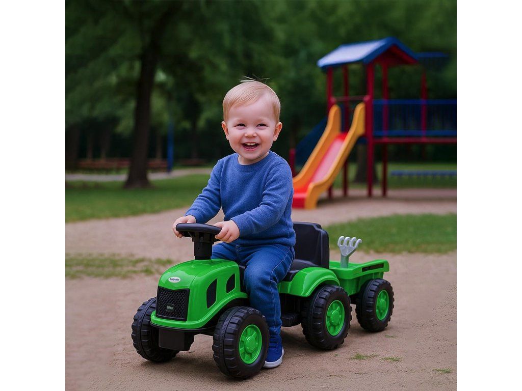 Traktor má rozmery 89 × 32 × 35,5 cm, je ľahký, no zároveň stabilný a unesie až 25 kg. Protišmykové kolesá sa postarajú o bezpečnú jazdu a pri hraní môže malý vodič navyše zatúrovať klaksónom. Do vlečky sa zmestí všetko potrebné – od hračiek až po piesok – a vďaka priloženej lopatke a hrabličkám sa môže začať poriadna práca na „poli“.