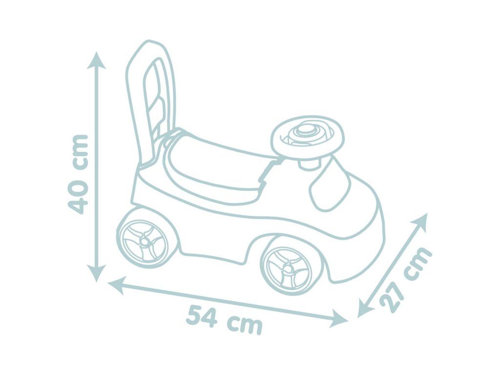Ľahké a stabilné ergonomické detské odrážadlo s protišmykovým volantom zaisťuje dobrú priľnavosť aj pri rýchlejšej jazde. Volant obsahuje aj klaksón. Vďaka stabilnej konštrukcii zaručuje vozidlo bezpečné potešenie z jazdy vo vnútri aj vonku. Chytrý dizajn ponúka opierku chrbta, ktorú je možné ľahko uchopiť. Takto sa dajú nacvičovať prvé krôčiky pri tlačení auta. Súčasťou výbavy je úložný priestor pod sedadlom. Nízka výška sedadla uľahčuje nastupovanie a vystupovanie. Predné a zadné nárazníky poskytujú dodatočnú stabilitu. Rozmery produktu (D׊×V): 54 × 27 × 40 cm.Dodatočné parametre