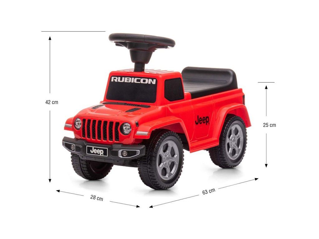 Licencovaný JEEP RUBICON GLADIATOR je odrážadlo, pri ktorého výrobe bola venovaná pozornosť aj tým najmenším detailom a kvalite použitých materiálov. Každého malého fanúšika áut poteší volant s realistickými zvukmi klaksónu a štartu motora. Vďaka použitiu podvozku s blokádou proti prevráteniu a kovovým osám poskytuje odrážadlo dieťaťu bezpečnú zábavu. Auto má ľahkú plastovú konštrukciu a ergonomické tvary zaisťujúce pohodlnú jazdu. Autíčko je jednak veľkou radosťou, jednak rozvíja zmysel pre rovnováhu a všeobecnú motoriku dieťaťa. Zábava prostredníctvom pohybových aktivít je skvelý spôsob, ako podporiť správny vývoj našich detí. Má volant a klaksón a tiež ukrýva pod sedadlom veľkú priehradku, kam si dieťa môže uložiť svoje hračky. Veľmi ľahko sa montuje a rozloží.