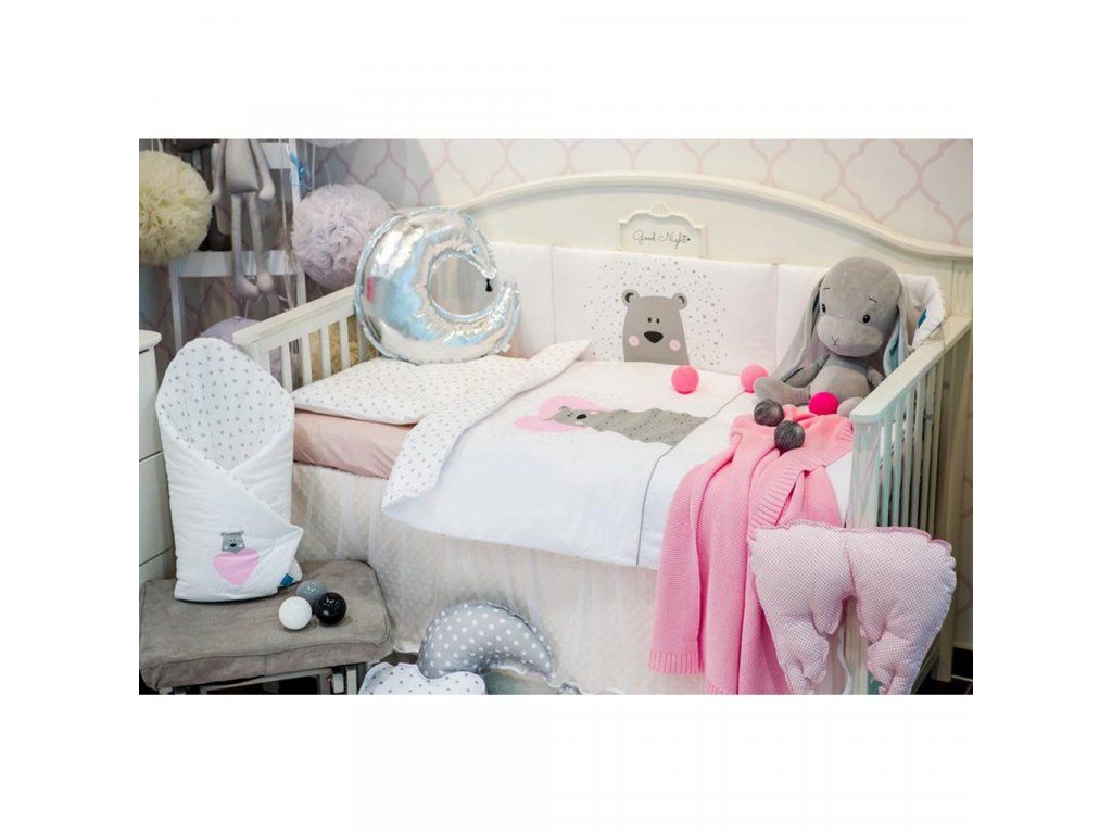Detská bavlnená 6-dielna súprava do postieľky Belisima Bear in love pre bábätká. Súprava je z jednej strany celopotlačená srdiečkami a druhá strana je zdobená obrázkom zamilovaného medvedíka. Je vyrobená z mäkkého, príjemného materiálu. Súprava obsahuje obliečky na vankúšik cca 40x60 cm, obliečky na paplón cca 100x135 cm, mantinel cca 180 cm, vankůš a paplón, baldachýn. Materiál 100% bavlna.Tieto výrobky sú bezpečné, pretože: