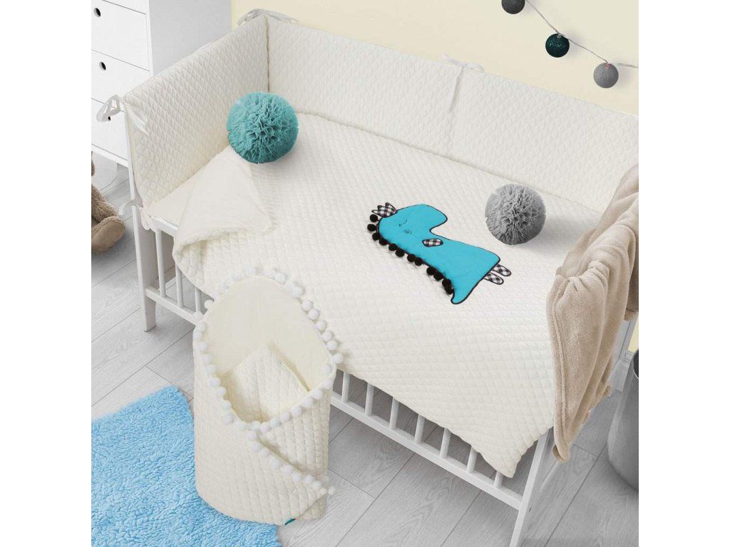 Detská 6-dielna súprava do postieľky Belisima Dino 3D pre bábätká. Súprava je zdobená 3D vzorom. Je vyrobená z mäkkého, príjemného materiálu. Zloženie: vrchná strana: 50% bavlna, 50% polyester. Spodná strana: 100% bavlna. Súprava obsahuje obliečku na vankúšik cca 40x60 cm, obliečku na paplón cca 100x135 cm, mantinel cca 180 cm, výplň: vankúšik, paplón a nebesá. Nebesá: 150x200 cm.Tieto výrobky sú bezpečné, pretože: