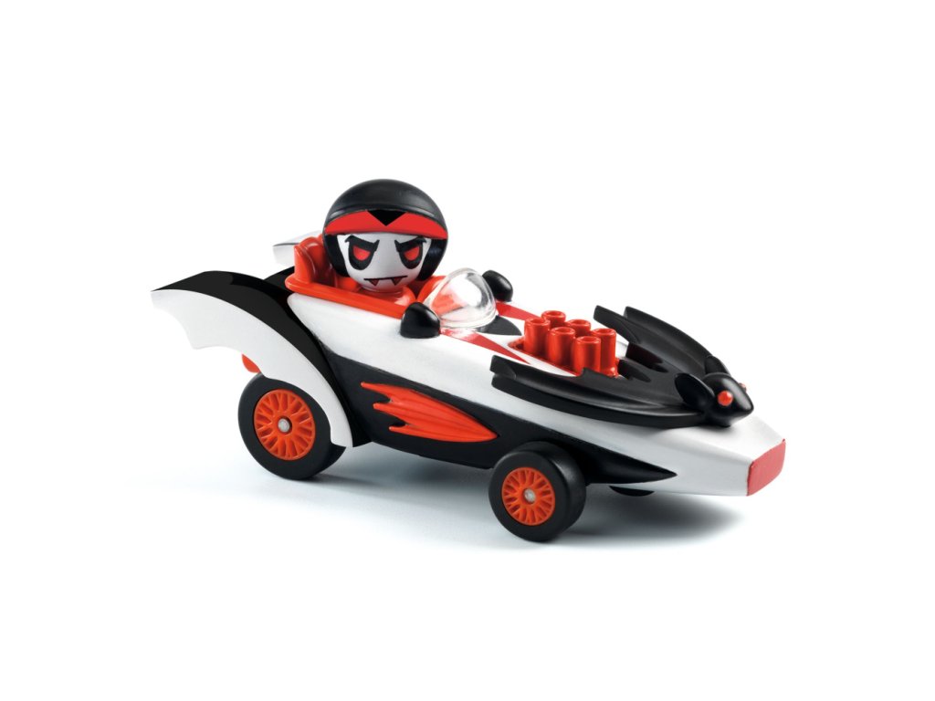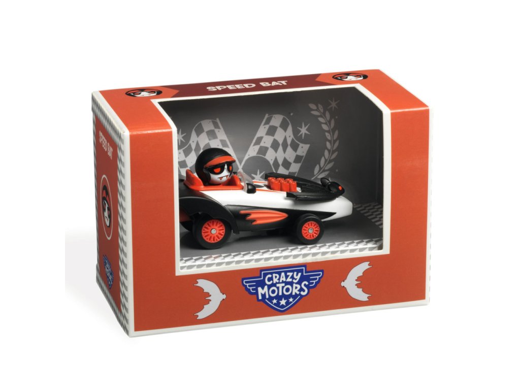 Crazy Motors Speed Bat je pretekárske kovové autíčko, ktoré sa vynára až po zotmení – bledý jazdec s „upírskymi“ detailmi hľadá súperov pre ďalšie