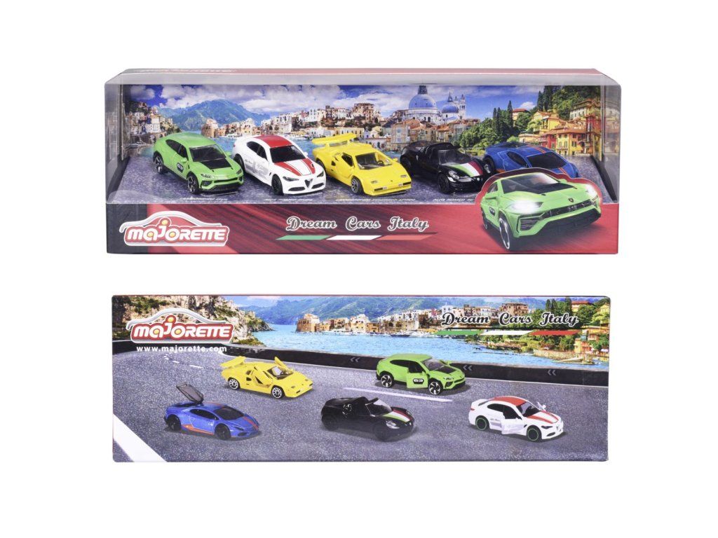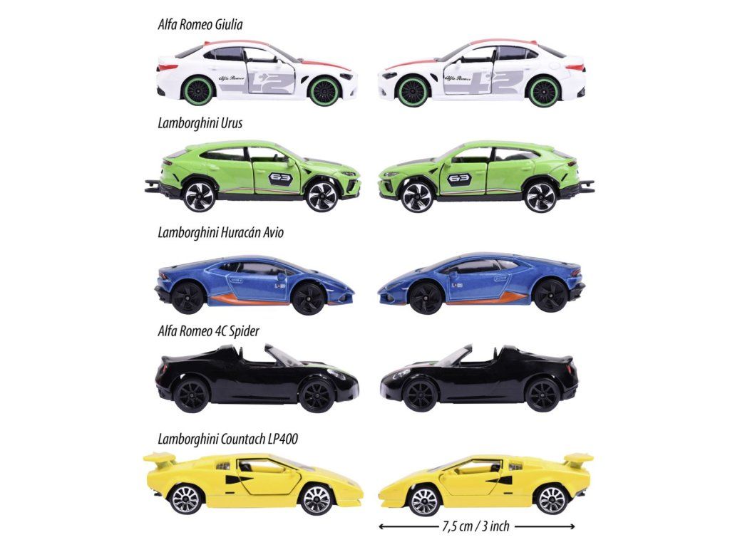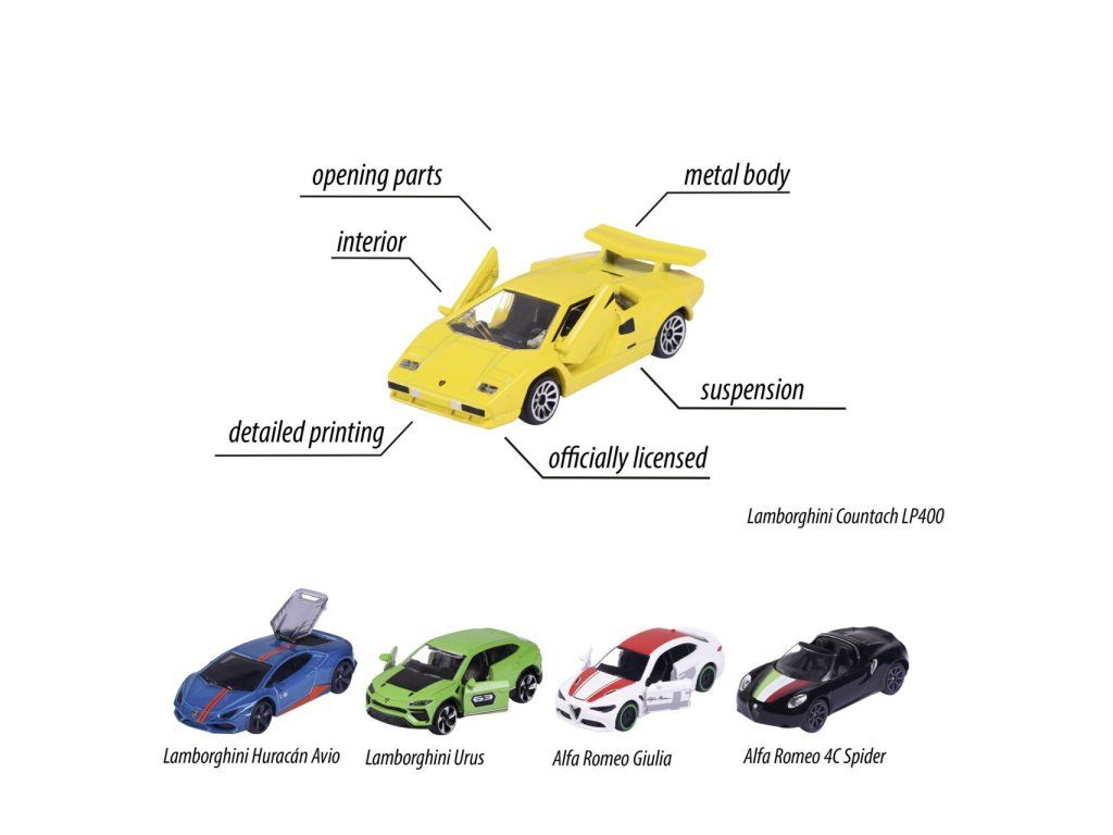 Darčeková súprava 5 rôznych talianskych autíčok. Kovové autíčka na voľnobeh s otočnými kolesami, zavesením a kĺbovými časťami. Obsahuje Alfu Romeo 4C Spider, Lamborghini Countach LP 400, Lamborghini Huracán Avio, Lamborghini Urus, Alfu Romeo Giulia. Dĺžka 7,5 cm.Dodatočné parametre