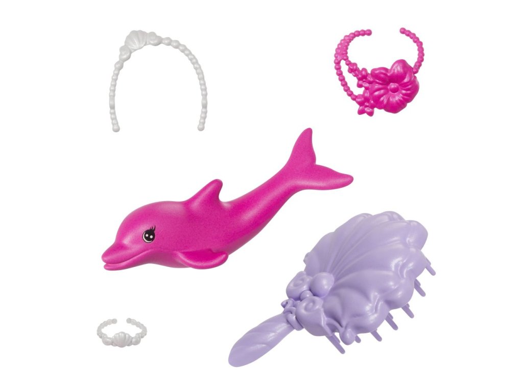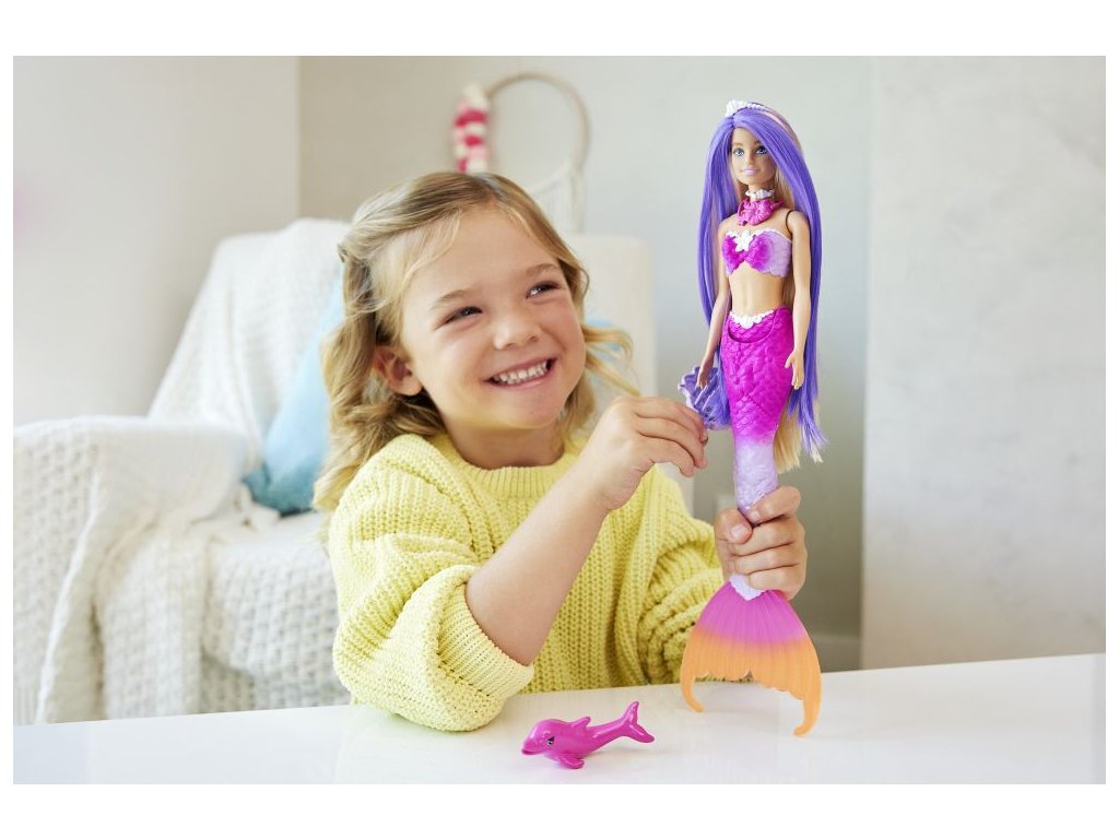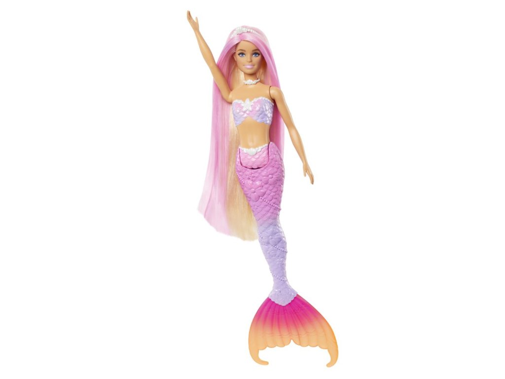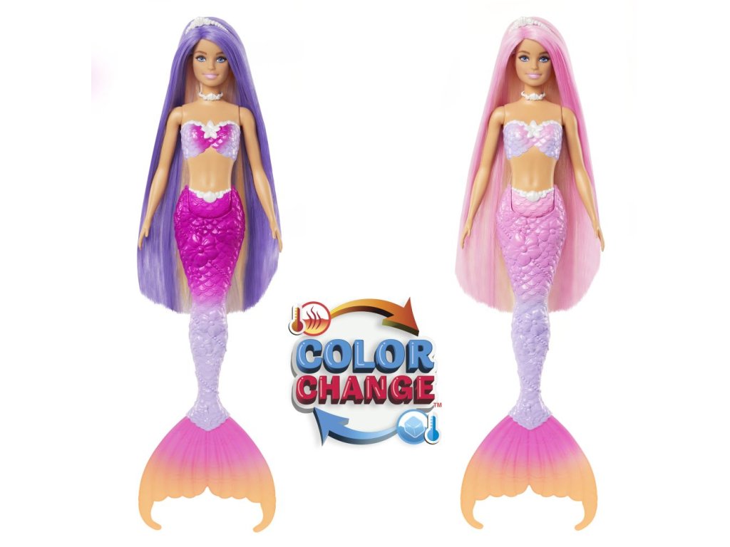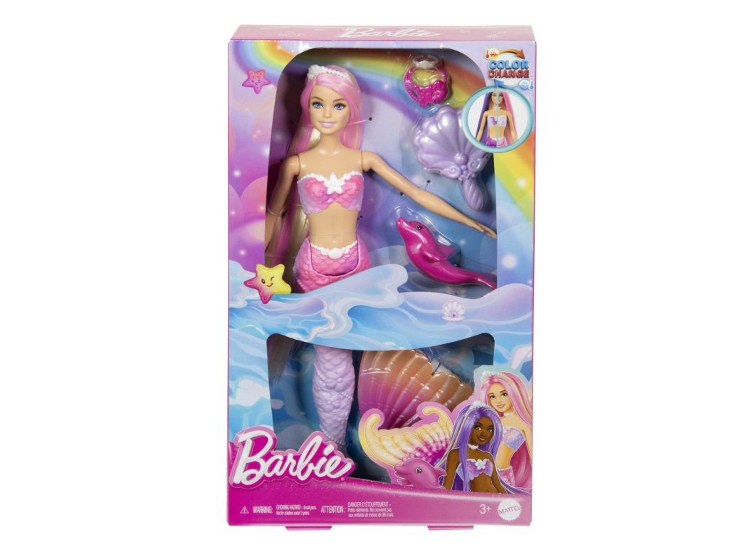 Táto bábika Barbie® morská panna inšpirovaná filmom Barbie® a dotyk kúzla dodáva hrám kúzlo vďaka možnosti premeny farieb! Akoby ju očarovala podmorská mágia, jej super dlhé vlasy, tvarovaný živôtik a ombre chvost mení farby z ružovej ako žuvačka na tmavo fialovú. Je navrhnutá s krásnymi detailmi od hlavy až po päty a patrí k nej aj stylingové doplnky, kefa a roztomilý maznáčik z oceánu! Bábika Barbie® nemôže plávať ani stáť samostatne. Farby a prevedenie dekorácií sa môžu líšiť.Dodatočné parametre