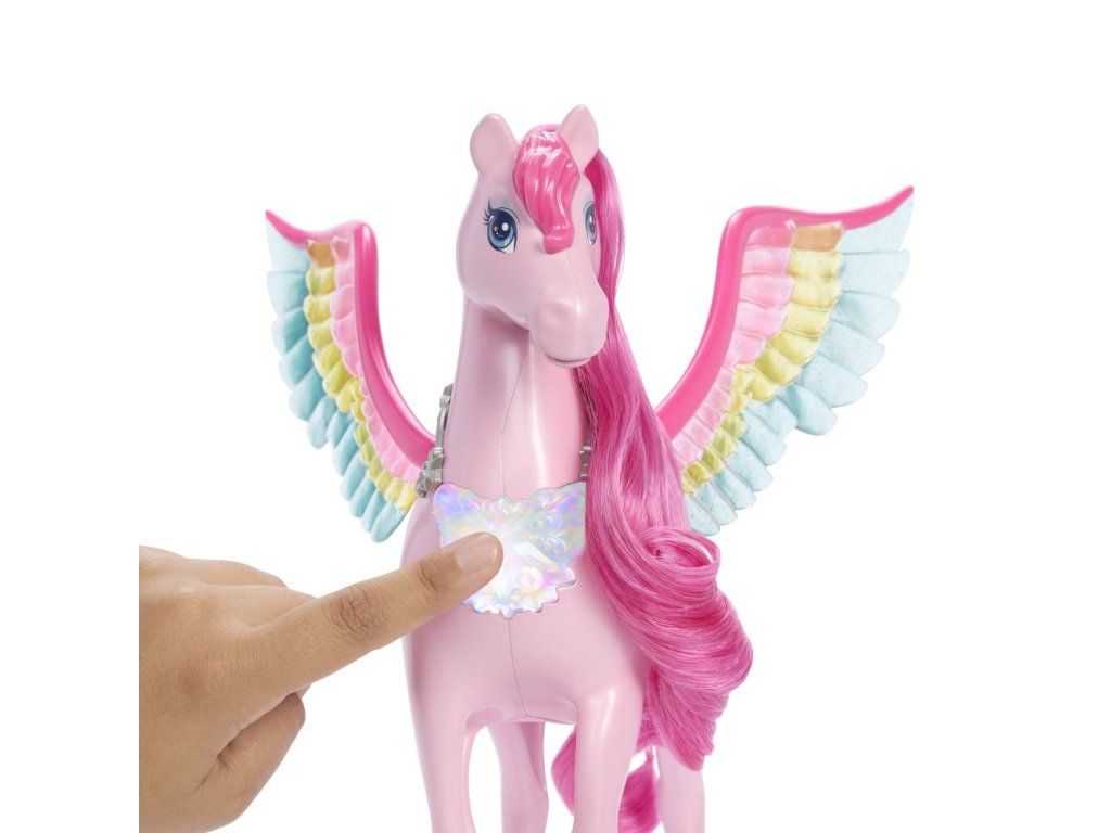 Nechajte fantáziu stúpať na krídlach tohto ružového pegasa Barbie®! Deti si môžu zahrať svoje obľúbené scény z filmu Barbie a dotyk kúzla alebo si vymýšľať vlastné fantastické dobrodružstvá. Kúzelný Pegas prichádza s 10 rôznymi doplnkami, a pýši sa svetlami a zvukmi! Stlačte náhrdelník pegase alebo pohnite krídlami, a spustia sa dúhové svetlá a magické zvuky vrátane hudby z filmu. Pegas Barbie® má ružovú hrivu a chvost a tiež trblietavé dúhové krídla! Medzi doplnky patrí kúzelné šteniatko, sladké maškrty, hrebeň a ďalšie roztomilé doplnky. Farby a vzhľad výrobku sa môžu líšiť.Dodatočné parametre