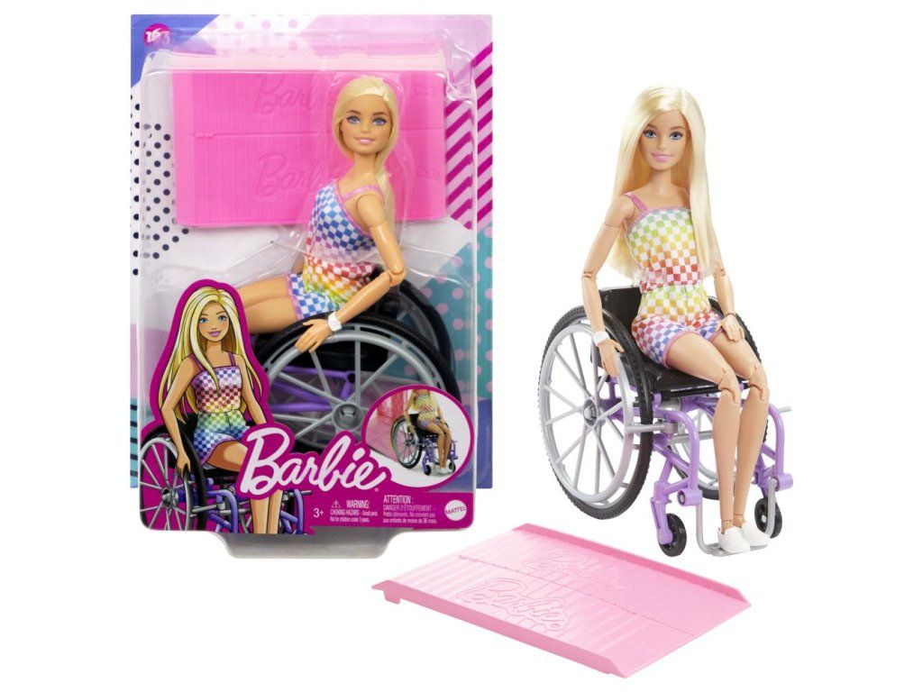 Barbie® Modelka na invalidnom vozíku je súčasťou kolekcie oslavujúcej rozmanitosť s módnymi bábikami, ktoré podporujú rozprávanie skutočných príbehov a rozvíjajú fantáziu! Vďaka širokej škále odtieňov pleti, farieb očí, farieb a typov vlasov, typov postavy a módnych štýlov sú bábiky navrhnuté tak, aby odrážali svet, ktorý vidia dnešné deti. Bábika Barbie® inšpiruje k novým možnostiam hrania vďaka manuálnemu fialovému invalidnému vozíku a ružovej rampe, aby mohla ľahko nastupovať a vystupovať z Barbie® Domu snov so svetlami a zvukmi (predáva sa samostatne, podľa dostupnosti). Bábika Barbie® má na sebe dúhovo kockovaný overal a 22 kĺbov pre rôzne možnosti pózovania a hrania. Bábika nevie samostatne stáť. Farby a vzhľad výrobku sa môžu líšiť.Dodatočné parametre