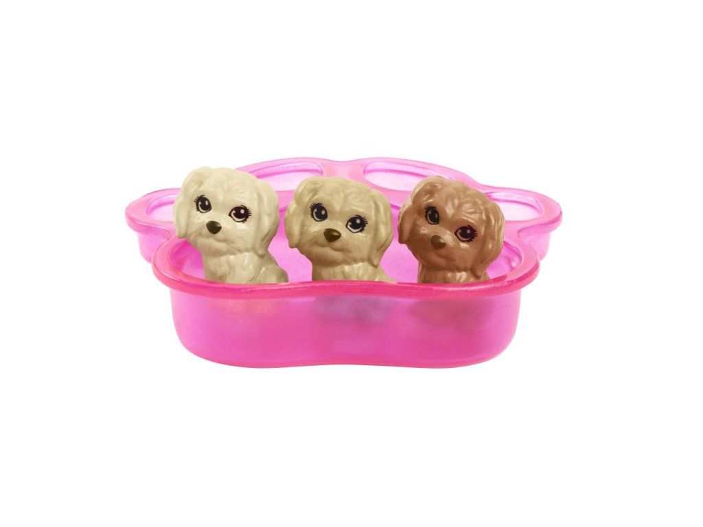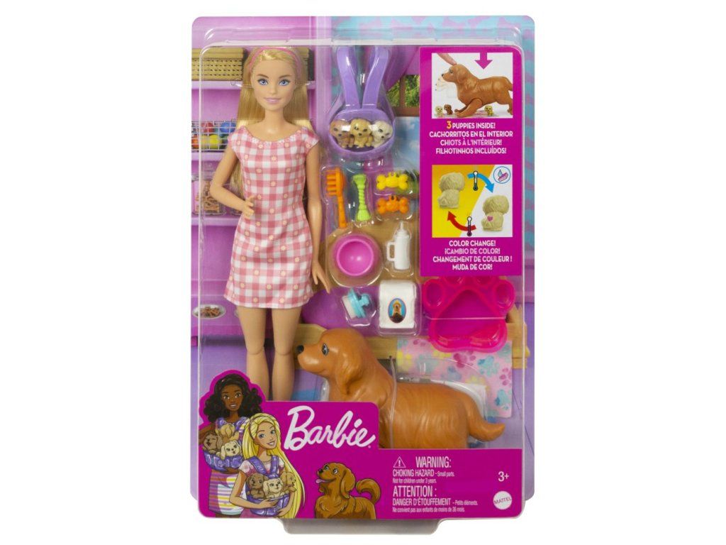 Herný set Barbie® Novonarodené šteniatka umožňuje fantázii preskúmať starostlivosť o domácich miláčikov! Tento herný set obsahuje sučku, ktorá je pripravená porodiť tri rozkošné šteniatka. Po príchode na svet môžu deti všetky tri šteniatka umiestniť do nositeľného pelechu bábiky Barbie® a starať sa o nich i na cestách. Použite studenú vodu a užite si prekvapenie v podobe špeciálneho materského znamienka na každom šteniatku. Potom použite teplú vodu, aby ste znamienko skryli a opakujte. Bábika Barbie® má ružové kockované šaty a ležérne topánky. Doplnky zahŕňajú kefy, dobroty pre šteniatka, ošetrovacie pomôcky a ďalšie.Dodatočné parametre