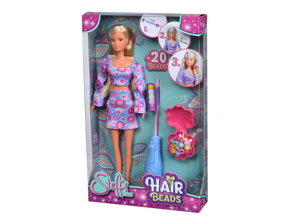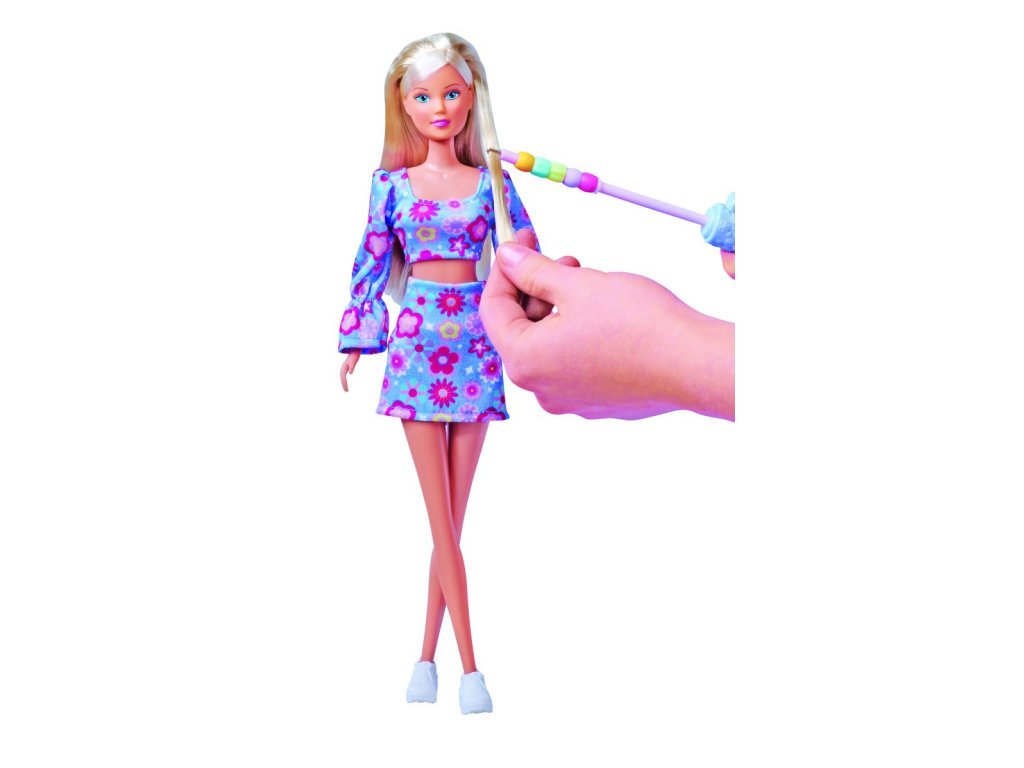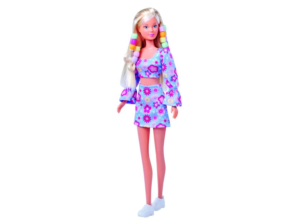 Bábika Steffi v kvetinovom dvojdielnom outfite, s háčikom na navliekanie korálikov na prameň vlasov, farebnými korálikmi, gumou na fixáciu a hrebeňom s úložným priestorom. Výška bábiky je 29 cm.Dodatočné parametre