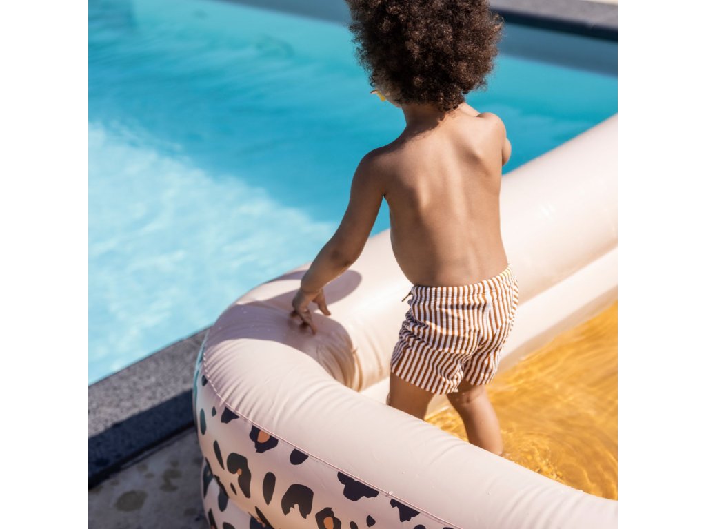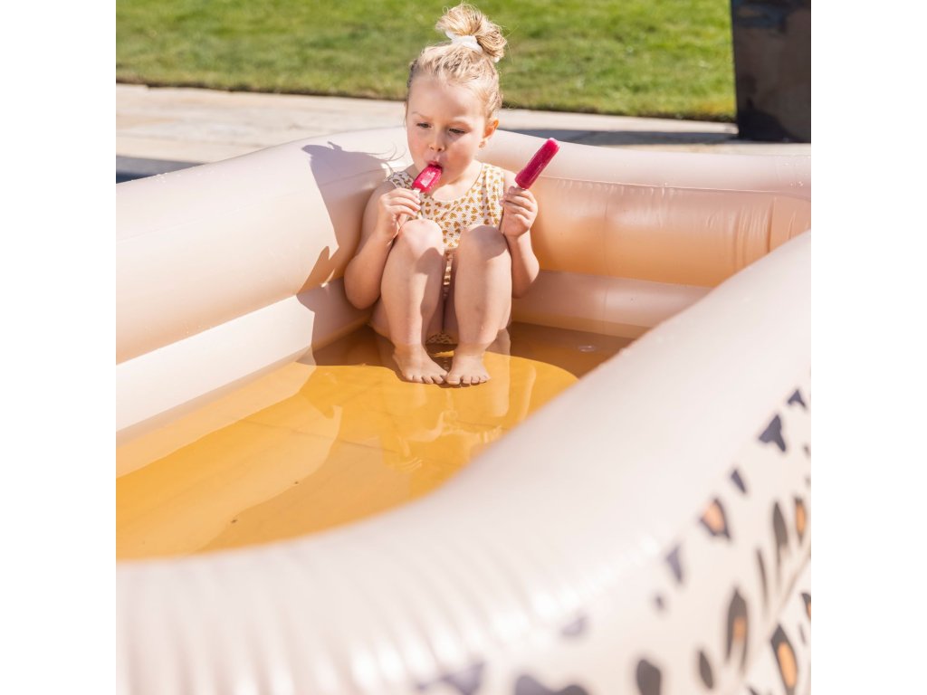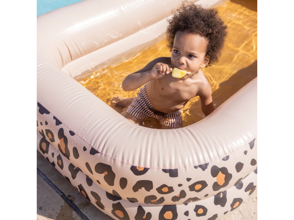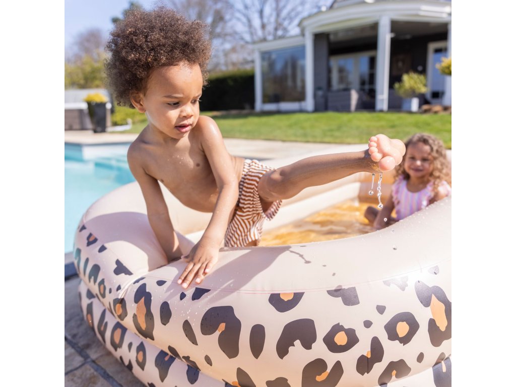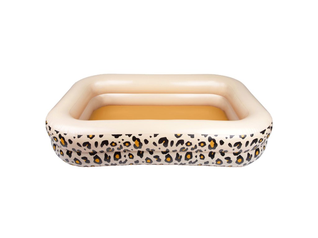 Detský nafukovací bazén obdĺžnik od značky Swim Essentials v dizajne Beige Leopard je ideálny na letné čľapkanie doma aj na chate. Vďaka väčšiemu objemu ponúkne viac priestoru na hru – bazén pojme približne 350 litrov vody, takže sa v ňom pohodlne zabaví aj viac detí naraz.