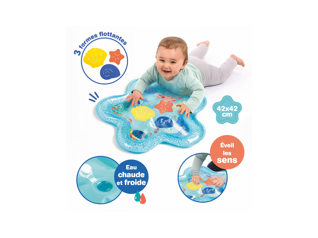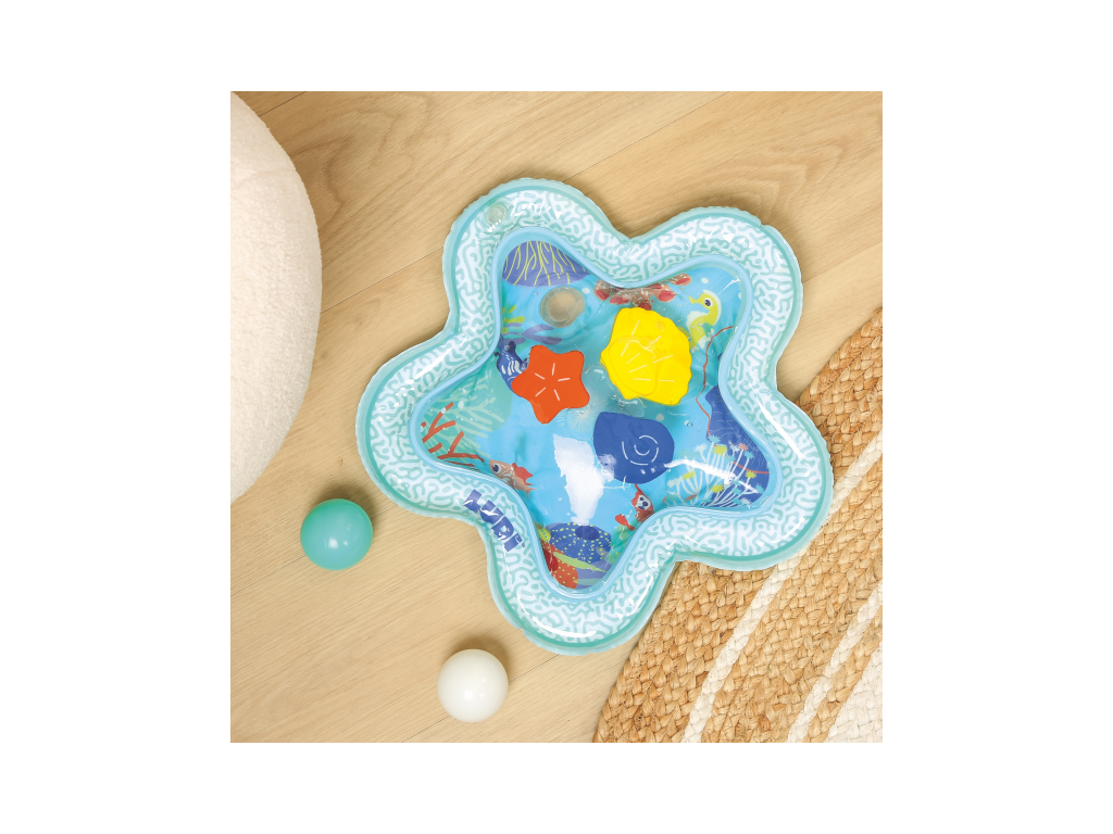 Interaktívna podložka na hranie naplnená vodou pripomína skutočný podmorský svet s vodnými živočíchmi. Figúrky morských tvorov sa vo vnútri vo vode začnú pohybovať, kedykoľvek dieťa na podložku siahne rukou.