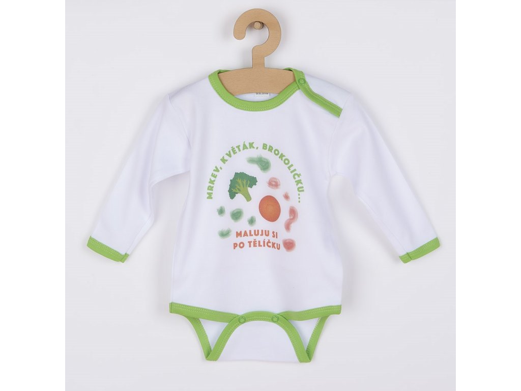 Originálne bavlnené dojčenské body s dlhým rukávom New Baby, s vtipným nápisom Mrkev, květák, brokoličku ... maluju si po tělíčku. Body má okolo krčku, nožičiek a ručičiek farebné lemovanie. Farby použité k potlači sú certifikované a vhodné pre bábätká. Je vyrobené z príjemného a kvalitného materiálu, v ktorom sa bude Vaše bábätko cítiť príjemne. Body má zapínanie na cvočky na ramienku a medzi nožičkami, čo uľahčuje obliekanie a prebaľovanie. Doprajte Vášmu bábätku vyniknúť v originálnom body. Zloženie: 100% bavlna. Rozmery: obvod okolo hrudníka cca 36 cm, dĺžka rukáva cca 18 cm, celková dĺžka cca 32 cm.Dodatočné parametre