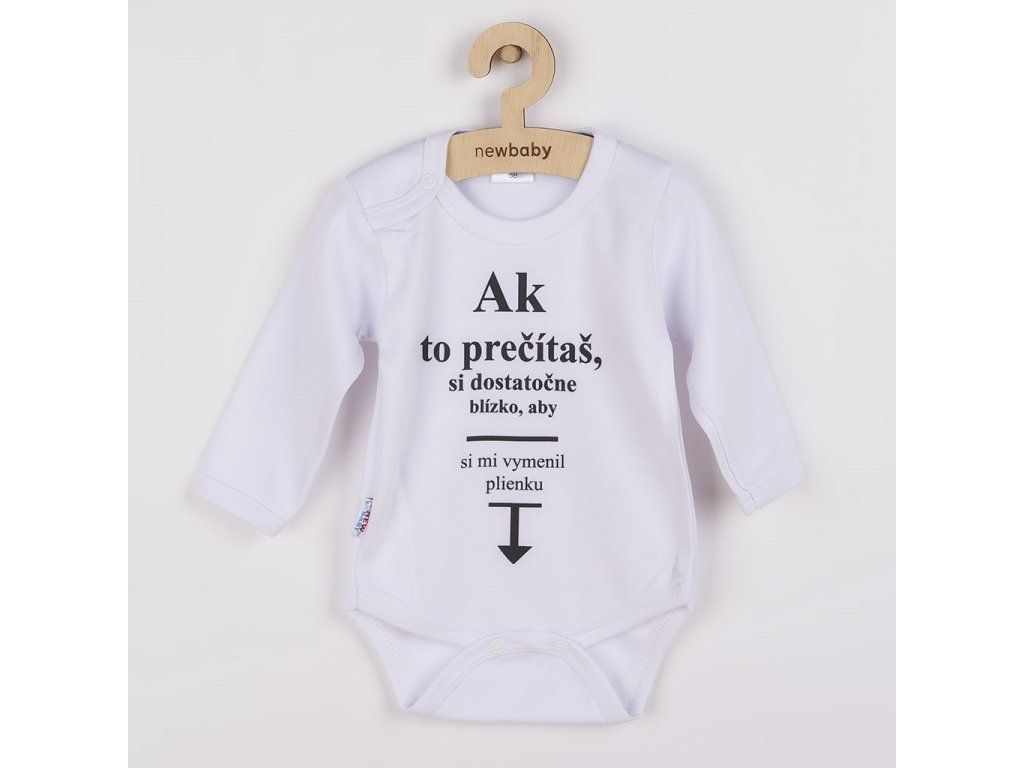 Originálne bavlnené dojčenské body s dlhým rukávom New Baby, s vtipným nápisom Ak to prečítaš, si dostatočne blízko, aby si mi vymenil plienku. Farby použité k potlači sú certifikované a vhodné pre bábätká. Je vyrobené z príjemného a kvalitného materiálu, v ktorom sa bude Vaše bábätko cítiť príjemne. Body má zapínanie na cvočky na ramienku a medzi nožičkami, čo uľahčuje obliekanie a prebaľovanie. Doprajte Vášmu bábätku vyniknúť v originálnom body. Zloženie: 100% bavlna. Rozmery: obvod okolo hrudníka cca 46 cm, dĺžka rukáva cca 24 cm, celková dĺžka cca 40 cm.Dodatočné parametre