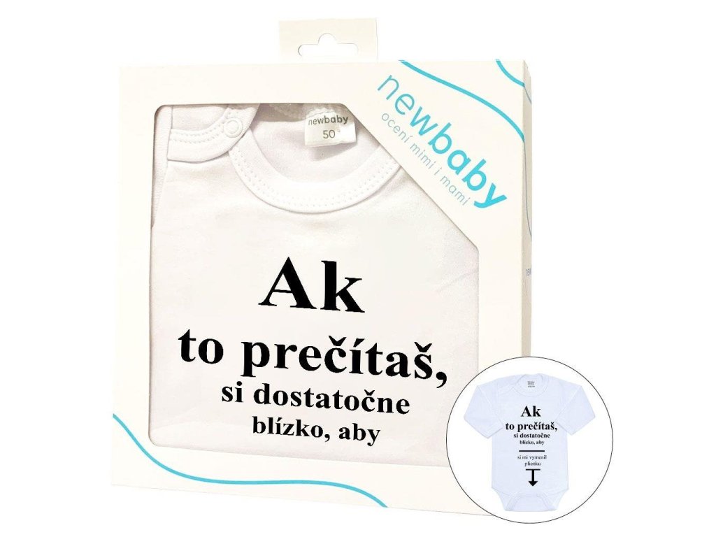 Originálne bavlnené dojčenské body s dlhým rukávom New Baby, s vtipným nápisom Ak to prečítaš, si dostatočne blízko, aby si mi vymenil plienku. Farby použité k potlači sú certifikované a vhodné pre bábätká. Je vyrobené z príjemného a kvalitného materiálu, v ktorom sa bude Vaše bábätko cítiť príjemne. Body má zapínanie na cvočky na ramienku a medzi nožičkami, čo uľahčuje obliekanie a prebaľovanie. Doprajte Vášmu bábätku vyniknúť v originálnom body. Zloženie: 100% bavlna. Rozmery: obvod okolo hrudníka cca 46 cm, dĺžka rukáva cca 24 cm, celková dĺžka cca 40 cm.Dodatočné parametre