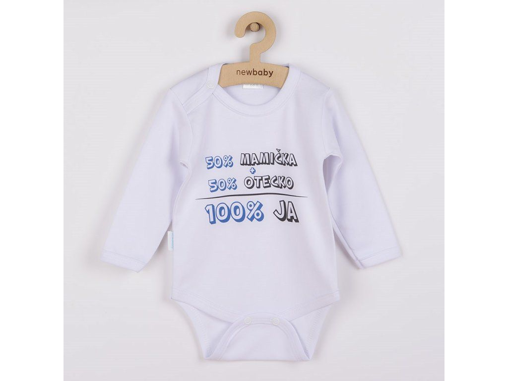 Originálne bavlnené dojčenské body s dlhým rukávom New Baby, s vtipným nápisom 50% MAMIČKA + 50% OTECKO - 100% JA. Farby použité k potlači sú certifikované a vhodné pre bábätká. Je vyrobené z príjemného a kvalitného materiálu, v ktorom sa bude Vaše bábätko cítiť príjemne. Body má zapínanie na cvočky na ramienku a medzi nožičkami, čo uľahčuje obliekanie a prebaľovanie. Doprajte Vášmu bábätku vyniknúť v originálnom body. Zloženie: 100% bavlna. Rozmery: obvod okolo hrudníka cca 50 cm, dĺžka rukáva cca 26 cm, celková dĺžka cca 42 cm.Dodatočné parametre