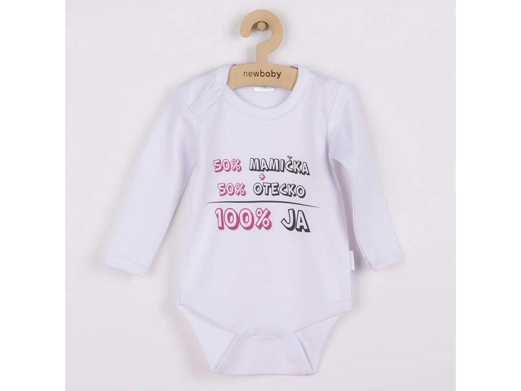 Originálne bavlnené dojčenské body s dlhým rukávom New Baby, s vtipným nápisom 50% MAMIČKA + 50% OTECKO - 100% JA. Farby použité k potlači sú certifikované a vhodné pre bábätká. Je vyrobené z príjemného a kvalitného materiálu, v ktorom sa bude Vaše bábätko cítiť príjemne. Body má zapínanie na cvočky na ramienku a medzi nožičkami, čo uľahčuje obliekanie a prebaľovanie. Doprajte Vášmu bábätku vyniknúť v originálnom body. Zloženie: 100% bavlna. Rozmery: obvod okolo hrudníka cca 36 cm, dĺžka rukáva cca 16 cm, celková dĺžka cca 30 cm.Dodatočné parametre
