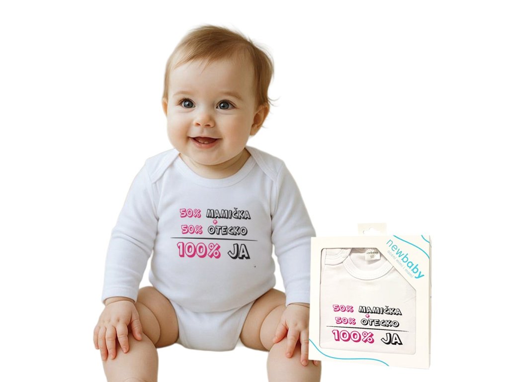 Originálne bavlnené dojčenské body s dlhým rukávom New Baby, s vtipným nápisom 50% MAMIČKA + 50% OTECKO - 100% JA. Body má okolo krčku, nožičiek a ručičiek farebné lemovanie. Farby použité k potlači sú certifikované a vhodné pre bábätká. Je vyrobené z príjemného a kvalitného materiálu, v ktorom sa bude Vaše bábätko cítiť príjemne. Body má zapínanie na cvočky na ramienku a medzi nožičkami, čo uľahčuje obliekanie a prebaľovanie. Doprajte Vášmu bábätku vyniknúť v originálnom body. Zloženie: 100% bavlna. Rozmery: obvod okolo hrudníka cca 46 cm, dĺžka rukáva cca 24 cm, celková dĺžka cca 40 cm.Dodatočné parametre