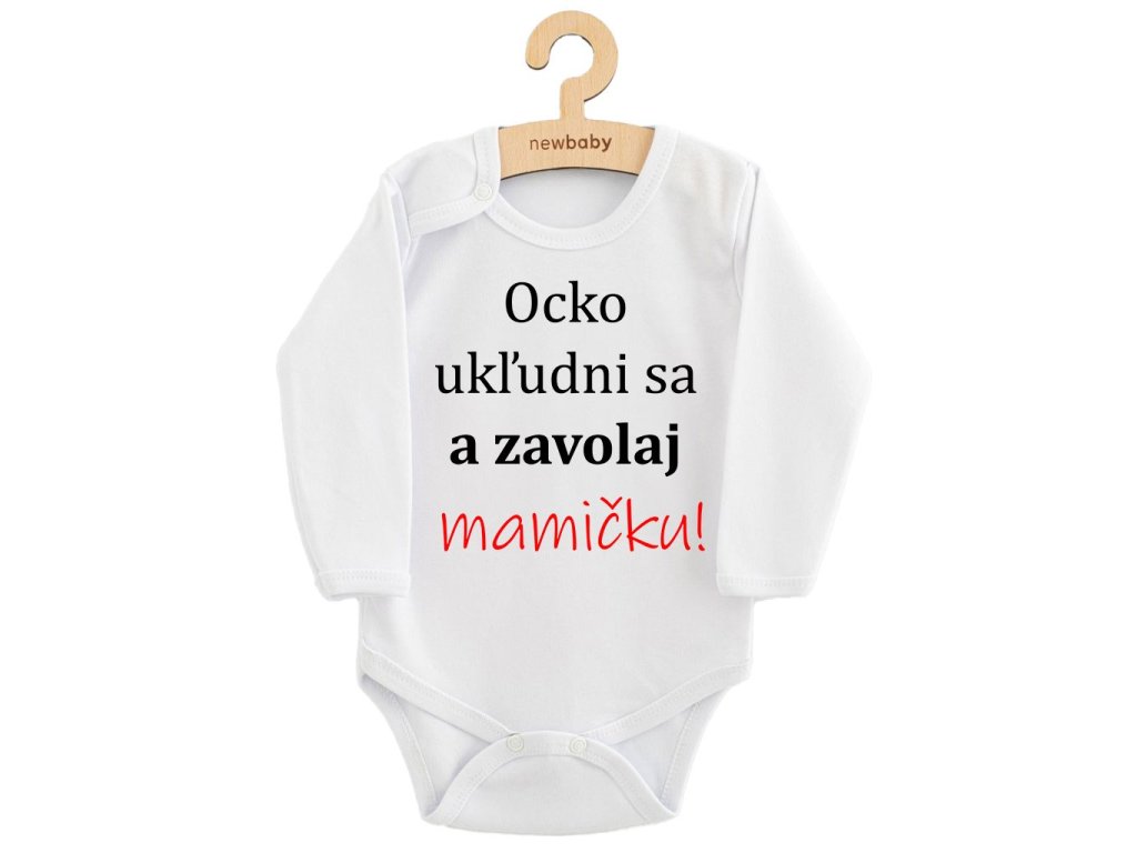 Originálne bavlnené dojčenské body s dlhým rukávom New Baby, s vtipným nápisom Ocko ukľudni sa a zavolaj MAMIČKU! Farby použité k potlači sú certifikované a vhodné pre bábätká. Je vyrobené z príjemného a kvalitného materiálu, v ktorom sa bude Vaše bábätko cítiť príjemne. Body má zapínanie na cvočky na ramienku a medzi nožičkami, čo uľahčuje obliekanie a prebaľovanie. Doprajte Vášmu bábätku vyniknúť v originálnom body. Zloženie: 100% bavlna. Rozmery: obvod okolo hrudníka cca 46 cm, dĺžka rukáva cca 24 cm, celková dĺžka cca 40 cm.Dodatočné parametre