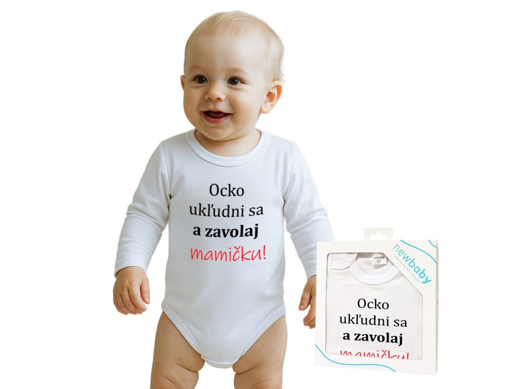 Originálne bavlnené dojčenské body s dlhým rukávom New Baby, s vtipným nápisom Ocko ukľudni sa a zavolaj MAMIČKU! Farby použité k potlači sú certifikované a vhodné pre bábätká. Je vyrobené z príjemného a kvalitného materiálu, v ktorom sa bude Vaše bábätko cítiť príjemne. Body má zapínanie na cvočky na ramienku a medzi nožičkami, čo uľahčuje obliekanie a prebaľovanie. Doprajte Vášmu bábätku vyniknúť v originálnom body. Zloženie: 100% bavlna. Rozmery: obvod okolo hrudníka cca 38 cm, dĺžka rukáva cca 21 cm, celková dĺžka cca 33 cm.Dodatočné parametre