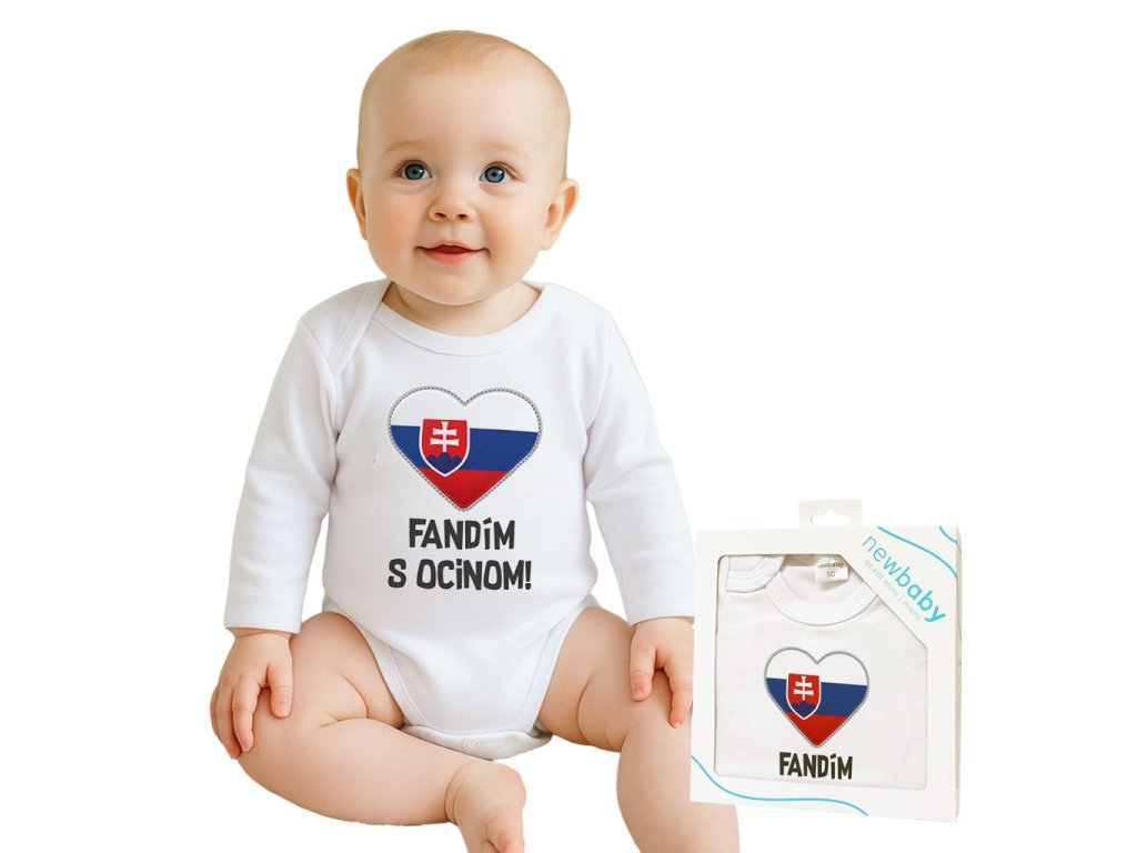 Originálne bavlnené dojčenské body s dlhým rukávom New Baby, s vtipným nápisom Fandím s ocinom a obrázkom slovenskej vlajky. Farby použité k potlači sú certifikované a vhodné pre bábätká. Je vyrobené z príjemného a kvalitného materiálu, v ktorom sa bude Vaše bábätko cítiť príjemne. Body má zapínanie na cvočky na ramienku a medzi nožičkami, čo uľahčuje obliekanie a prebaľovanie. Doprajte Vášmu bábätku vyniknúť v originálnom body. Zloženie: 100% bavlna. Rozmery: obvod okolo hrudníka cca 34 cm, dĺžka rukáva cca 16 cm, celková dĺžka cca 30 cm.Dodatočné parametre