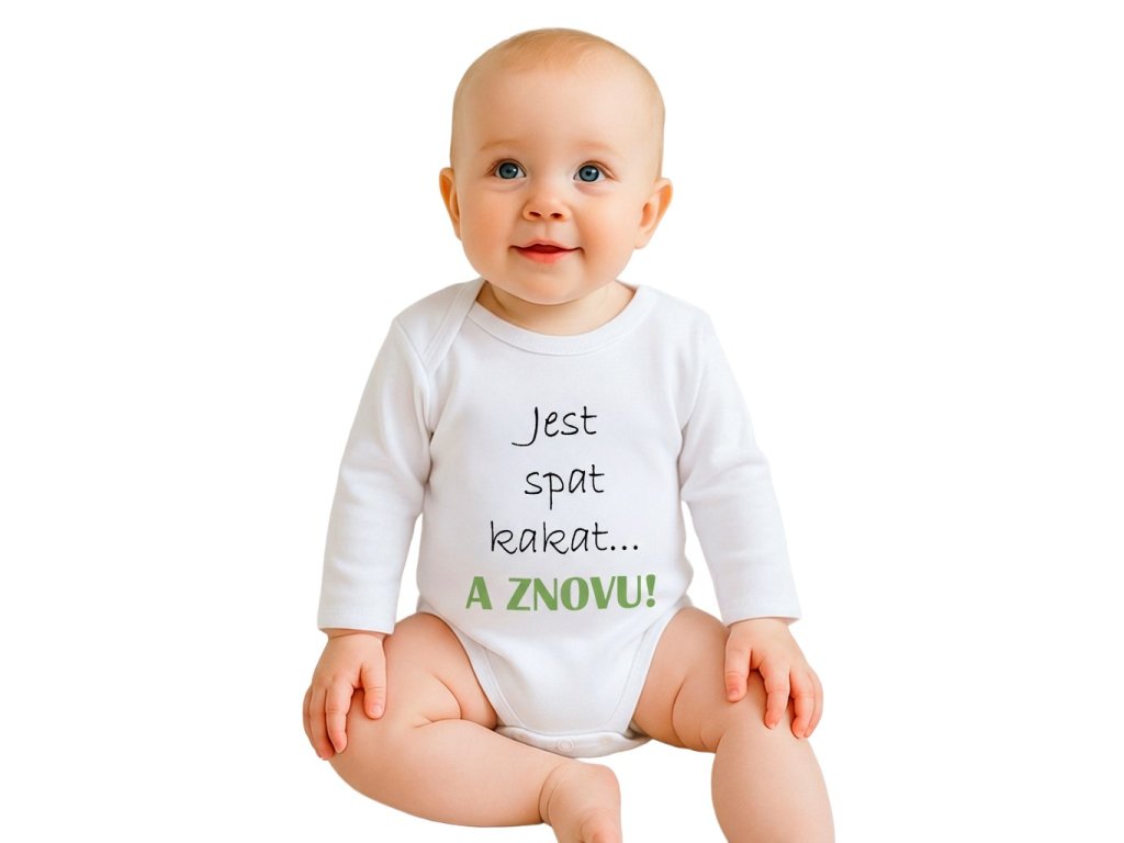 Originálne bavlnené dojčenské body s dlhým rukávom New Baby, s vtipným nápisom Jesť spať kakať...a ZNOVU. Farby použité k potlači sú certifikované a vhodné pre bábätká. Je vyrobené z príjemného a kvalitného materiálu, v ktorom sa bude Vaše bábätko cítiť príjemne. Body má zapínanie na cvočky na ramienku a medzi nožičkami, čo uľahčuje obliekanie a prebaľovanie. Doprajte Vášmu bábätku vyniknúť v originálnom body. Zloženie: 100% bavlna. Rozmery: obvod okolo hrudníka cca 34 cm, dĺžka rukáva cca 16 cm, celková dĺžka cca 30 cm.Dodatočné parametre