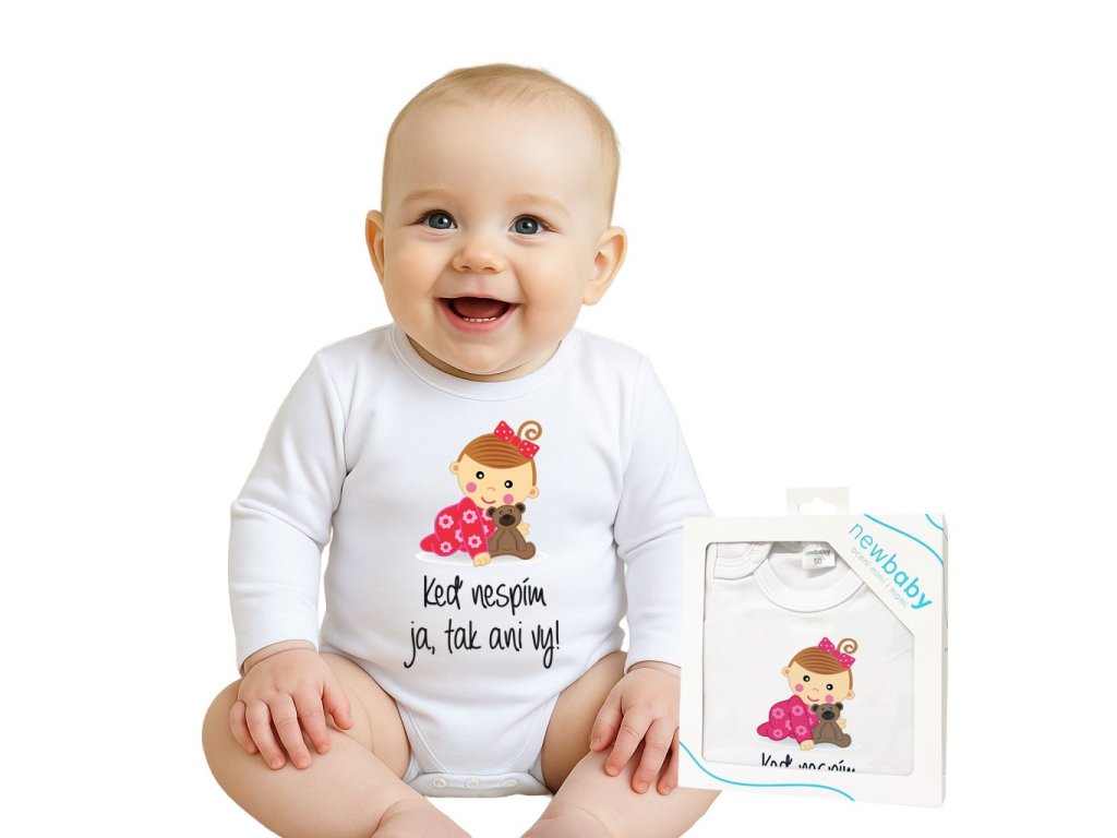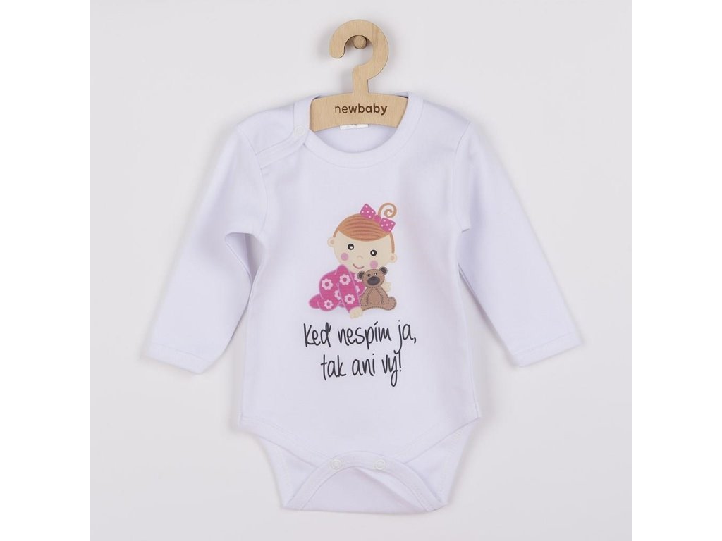 Originálne bavlnené dojčenské body s dlhým rukávom New Baby, s vtipným nápisom Keď nespím ja, tak ani vy! A obrázkom roztomilého dievčatka. Body má okolo krčku, nožičiek a ručičiek farebné lemovanie. Farby použité k potlači sú certifikované a vhodné pre bábätká. Je vyrobené z príjemného a kvalitného materiálu, v ktorom sa bude Vaše bábätko cítiť príjemne. Body má zapínanie na cvočky na ramienku a medzi nožičkami, čo uľahčuje obliekanie a prebaľovanie. Doprajte Vášmu bábätku vyniknúť v originálnom body. Zloženie: 100% bavlna. Rozmery: obvod okolo hrudníka cca 50 cm, dĺžka rukáva cca 26 cm, celková dĺžka cca 42 cm.Dodatočné parametre