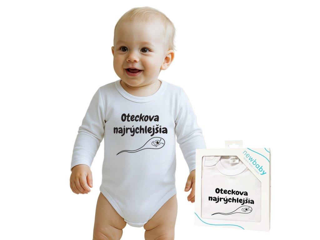 Originálne bavlnené dojčenské body s dlhým rukávom New Baby, s vtipným nápisom OTECKOVA NAJRÝCHLEJŠIA. Farby použité k potlači sú certifikované a vhodné pre bábätká. Je vyrobené z príjemného a kvalitného materiálu, v ktorom sa bude Vaše bábätko cítiť príjemne. Body má zapínanie na cvočky na ramienku a medzi nožičkami, čo uľahčuje obliekanie a prebaľovanie. Doprajte Vášmu bábätku vyniknúť v originálnom body. Zloženie: 100% bavlna. Rozmery: obvod okolo hrudníka cca 34 cm, dĺžka rukáva cca 16 cm, celková dĺžka cca 30 cm.Dodatočné parametre