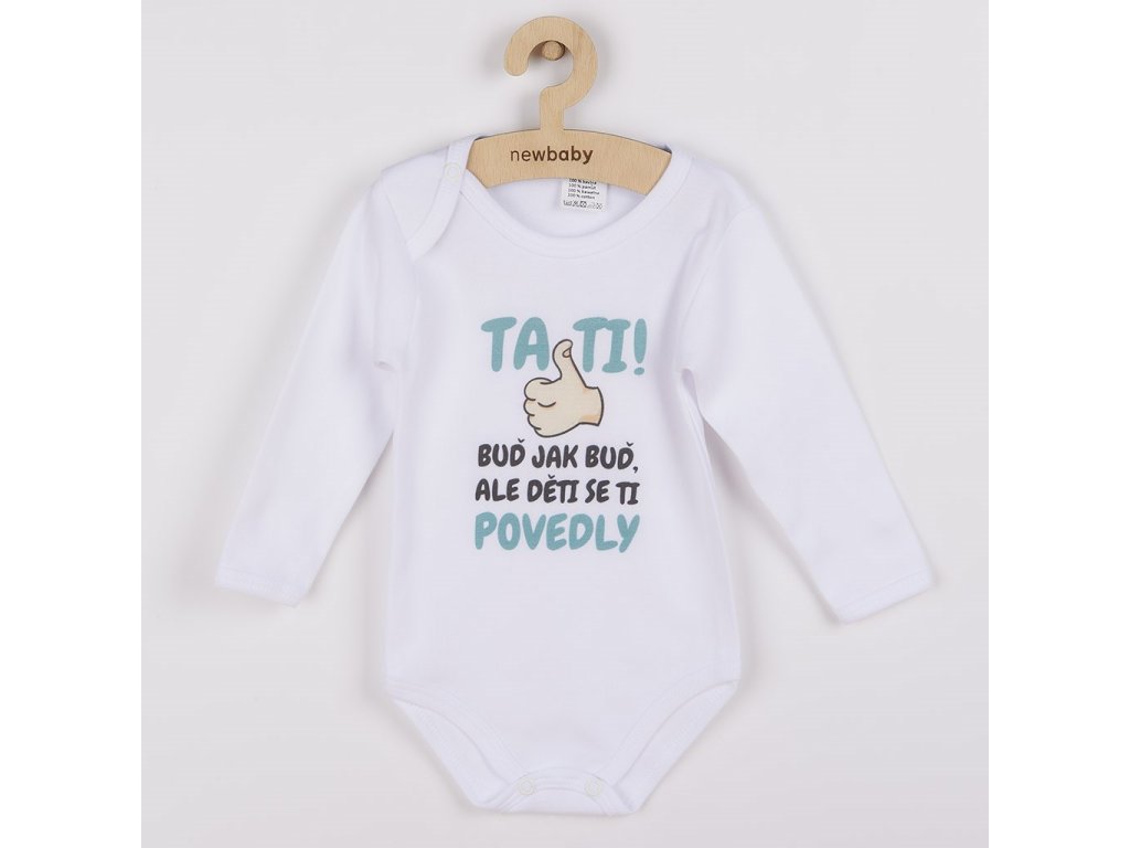 Originálne bavlnené dojčenské body s dlhým rukávom New Baby, s vtipným nápisom TATI, BUĎ JAK BUĎ,ALE DĚTI SE TI POVEDLY. Farby použité k potlači sú certifikované a vhodné pre bábätká. Je vyrobené z príjemného a kvalitného materiálu, v ktorom sa bude Vaše bábätko cítiť príjemne. Body má zapínanie na cvočky na ramienku a medzi nožičkami, čo uľahčuje obliekanie a prebaľovanie. Doprajte Vášmu bábätku vyniknúť v originálnom body. Zloženie: 100% bavlna. Rozmery: obvod okolo hrudníka cca 34 cm, dĺžka rukáva cca 16 cm, celková dĺžka cca 30 cm.Dodatočné parametre