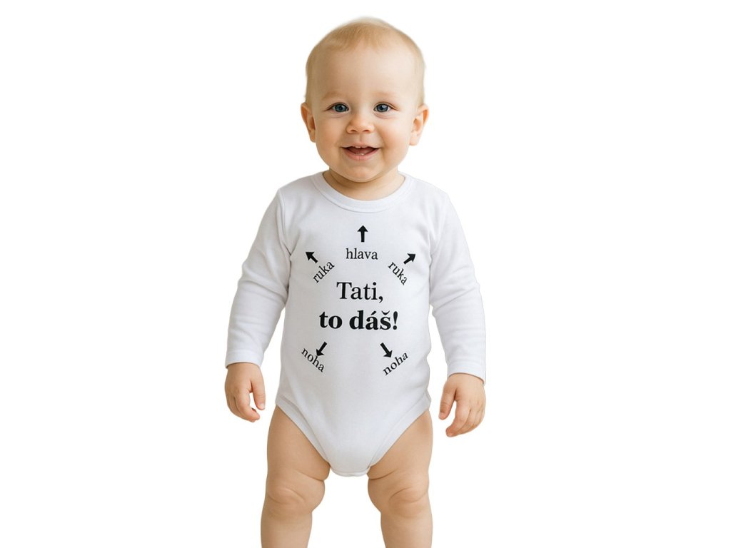 Originálne bavlnené dojčenské body s dlhým rukávom New Baby, s vtipným nápisom Tati, to dáš! Farby použité k potlači sú certifikované a vhodné pre bábätká. Je vyrobené z príjemného a kvalitného materiálu, v ktorom sa bude Vaše bábätko cítiť príjemne. Body má zapínanie na cvočky na ramienku a medzi nožičkami, čo uľahčuje obliekanie a prebaľovanie. Doprajte Vášmu bábätku vyniknúť v originálnom body. Zloženie: 100% bavlna. Rozmery: obvod okolo hrudníka cca 50 cm, dĺžka rukáva cca 26 cm, celková dĺžka cca 42 cm.Dodatočné parametre