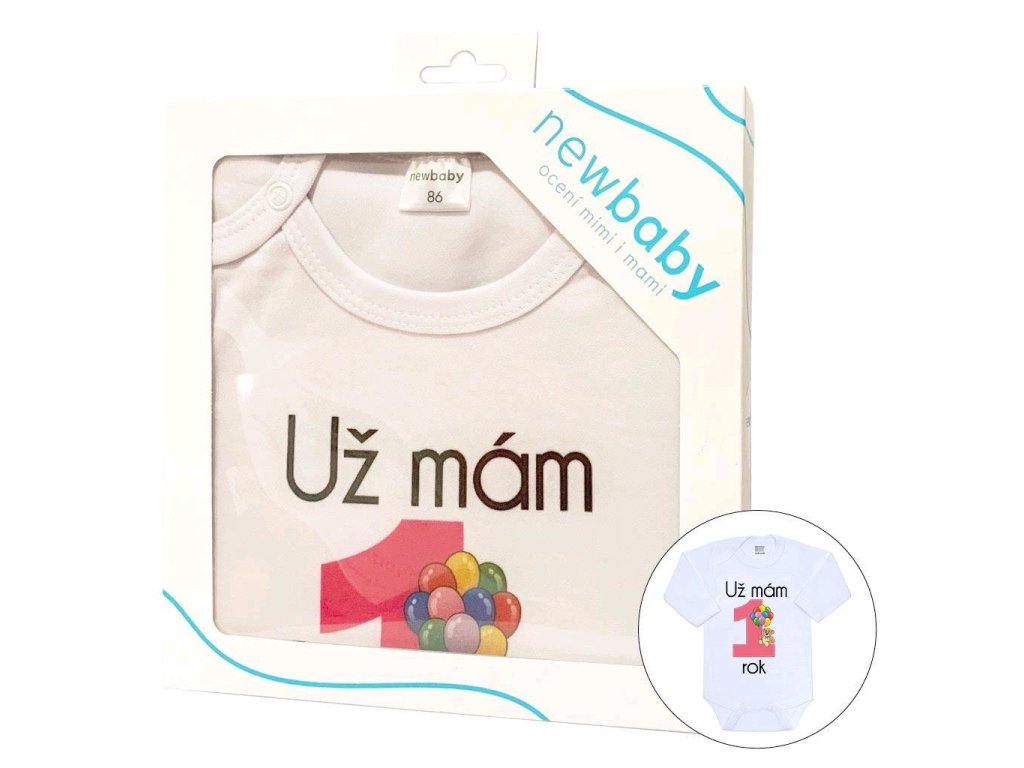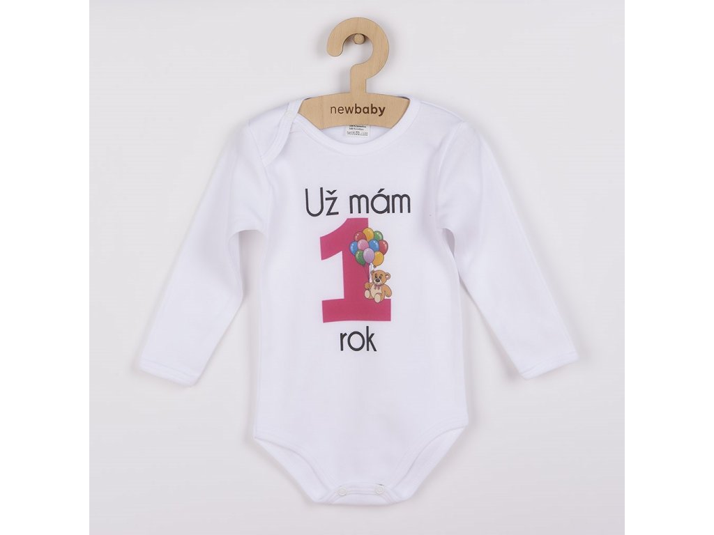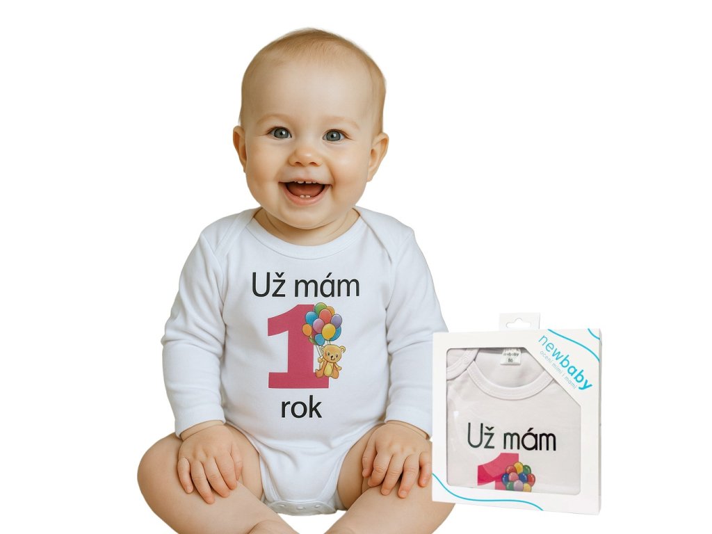 Originálne bavlnené dojčenské body s dlhým rukávom New Baby, s vtipným nápisom Už mám 1 rok a obrázkom veľkej jednotky s balónikmi. Farby použité k potlači sú certifikované a vhodné pre bábätká. Je vyrobené z príjemného a kvalitného materiálu, v ktorom sa bude Vaše bábätko cítiť príjemne. Body má zapínanie na cvočky na ramienku a medzi nožičkami, čo uľahčuje obliekanie a prebaľovanie. Doprajte Vášmu bábätku vyniknúť v originálnom body. Zloženie: 100% bavlna. Rozmery: obvod okolo hrudníka cca 50 cm, dĺžka rukáva cca 26 cm, celková dĺžka cca 42 cm.Dodatočné parametre