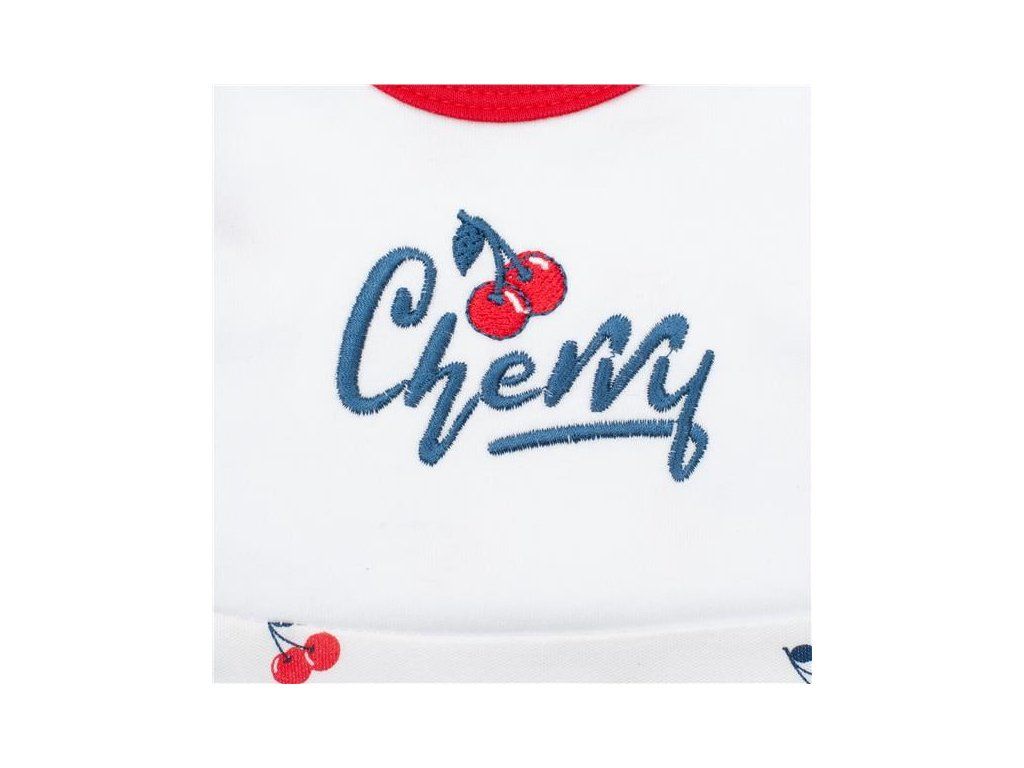 Bavlnené body s dlhým rukávom New Baby Cherry pre bábätká. Dievčenské body je celopotlačené čerešničkami. Rukávky sú ukončené jemnou gumičkou a volánikom s farebným lemovaním. Vrchná časť je zdobená nášivkou Cherry s čerešničkami. Nášivka je podlepená proti poškriabaniu. Okolo krčku a nožičiek je farebné lemovanie. Zapínanie na cvočky na ramienku a medzi nožičkami. Zloženie: 100% bavlna.Dodatočné parametre