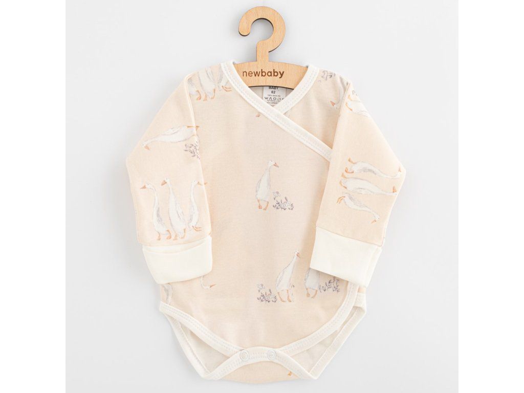 Nápadité bavlnené dojčenské body s dlhým rukávom New Baby z kolekcie Husičky. Krásny detský motív s roztomilými husičkami, polahodí detským očkám. Veľmi príjemný, mäkký a kvalitný materiál je vhodný pre bábätká. Bočné zapínanie po celej dĺžke na cvočky a medzi nožičkami uľahčí obliekanie a prebaľovanie. Rukávky body možno vyhrnúť. Ohrnutý rukáv zabráni poškriabaniu detskými nechtíkmi a udrží ručičky bábätka v teple. Zloženie: 100% bavlna. OEKO-TEX ŠTANDARD 100.Dodatočné parametre