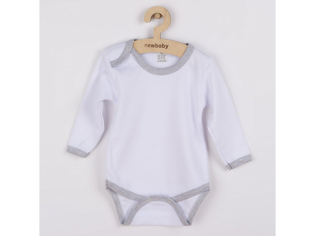 Bavlnené dojčenské body s dlhým rukávom a farebným lemom New Baby. Zapínanie na cvočky na ramienku a medzi nožičkami uľahčí obliekanie a prebaľovanie. Má veľmi príjemný, mäkký a kvalitný materiál, ktorý je vhodný pre bábätká. Zloženie: 100% bavlna.Dodatočné parametre