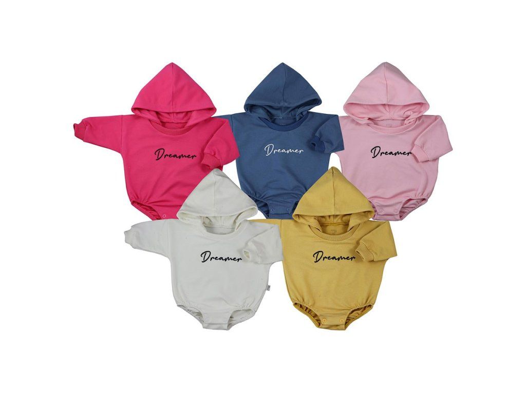 Nápadité body s dlhým rukávom a kapucňou Koala Dreamer. Body má zapínanie na cvočky medzi nožičkami čo uľahčuje obliekanie a prebaľovanie. Okolo krčku je pružný lem pre ľahké obliekanie cez hlavičku. Je zdobené nápisom Dreamer a je ušité v štýle baggy z veľmi príjemnej teplákoviny. Body je pre bábätká dôležitým kúskom oblečenia. Pri akomkoľvek pohybe je chrbátik bábätka stále prikrytý. Materiál: 96% bavlna, 4% elastan.Dodatočné parametre