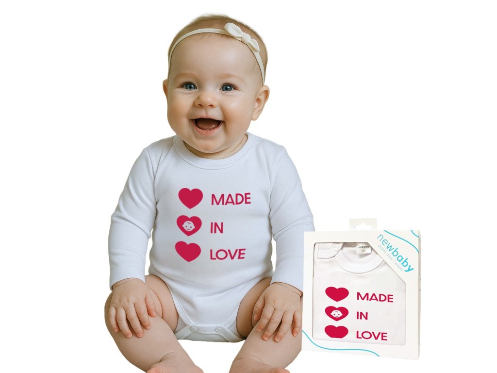 Originálne bavlnené dojčenské body s krátkym rukávom New Baby s nápisom MADE IN LOVE a obrázkom. Farby použité k potlači sú certifikované a vhodné pre bábätká. Je vyrobené z príjemného a kvalitného materiálu, v ktorom sa bude Vaše bábätko cítiť príjemne. Body má zapínanie na cvočky na ramienku a medzi nožičkami, čo uľahčuje obliekanie a prebaľovanie. Doprajte Vášmu bábätku vyniknúť v originálnom body. Zloženie: 100% bavlna.Dodatočné parametre