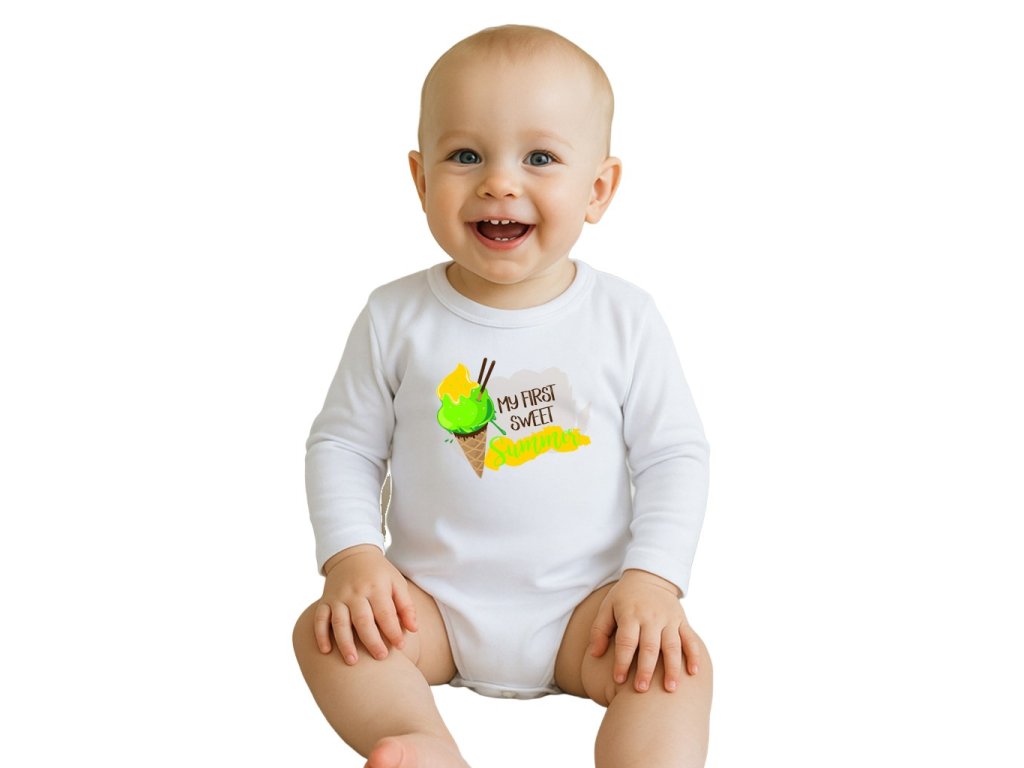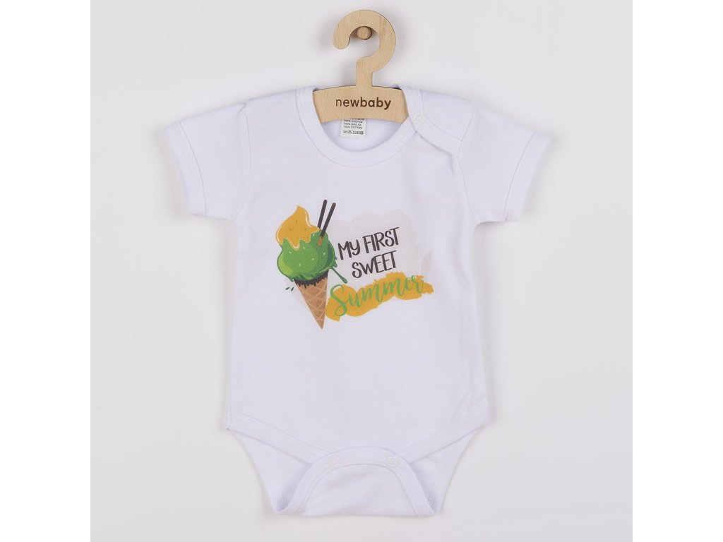 Originálne bavlnené dojčenské body s krátkym rukávom New Baby s nápisom MY FIRST SWEET Summer a obrázkom chutnej zmrzlinky. Farby použité k potlači sú certifikované a vhodné pre bábätká. Je vyrobené z príjemného a kvalitného materiálu, v ktorom sa bude Vaše bábätko cítiť príjemne. Body má zapínanie na cvočky na ramienku a medzi nožičkami, čo uľahčuje obliekanie a prebaľovanie. Doprajte Vášmu bábätku vyniknúť v originálnom body. Zloženie: 100% bavlna.Dodatočné parametre