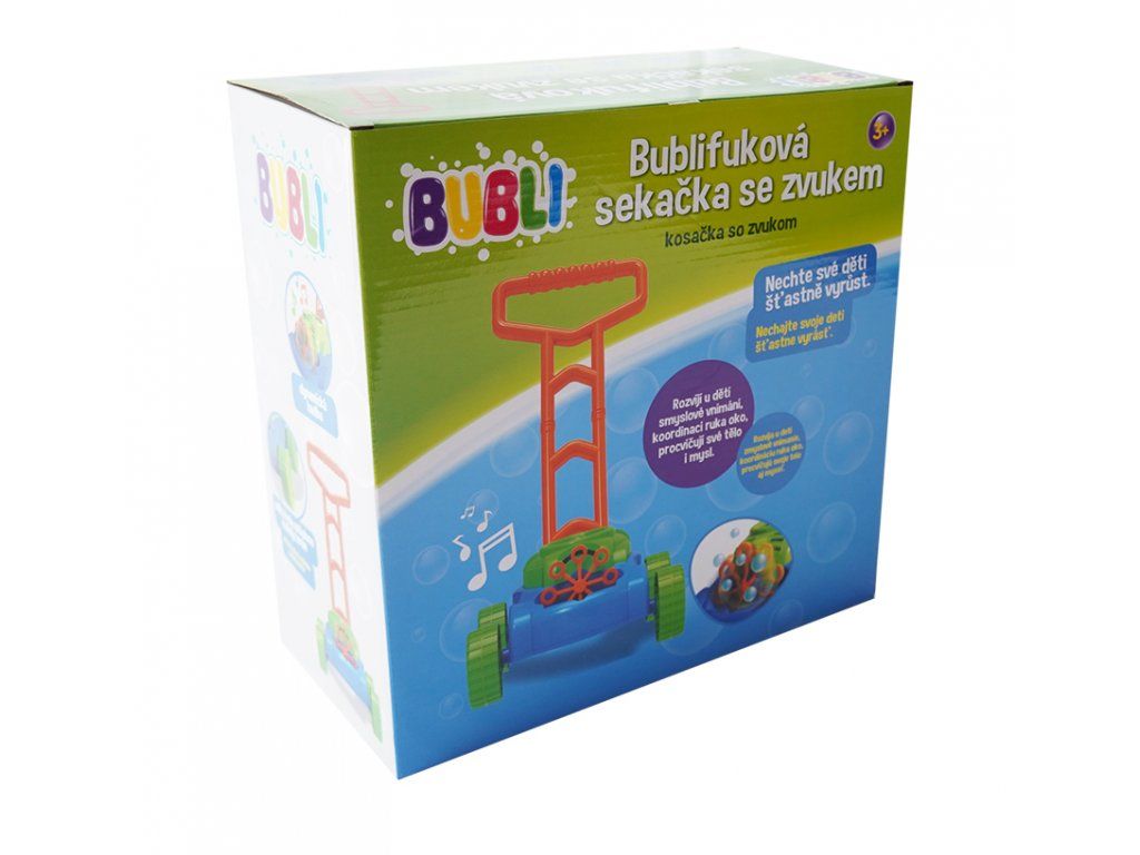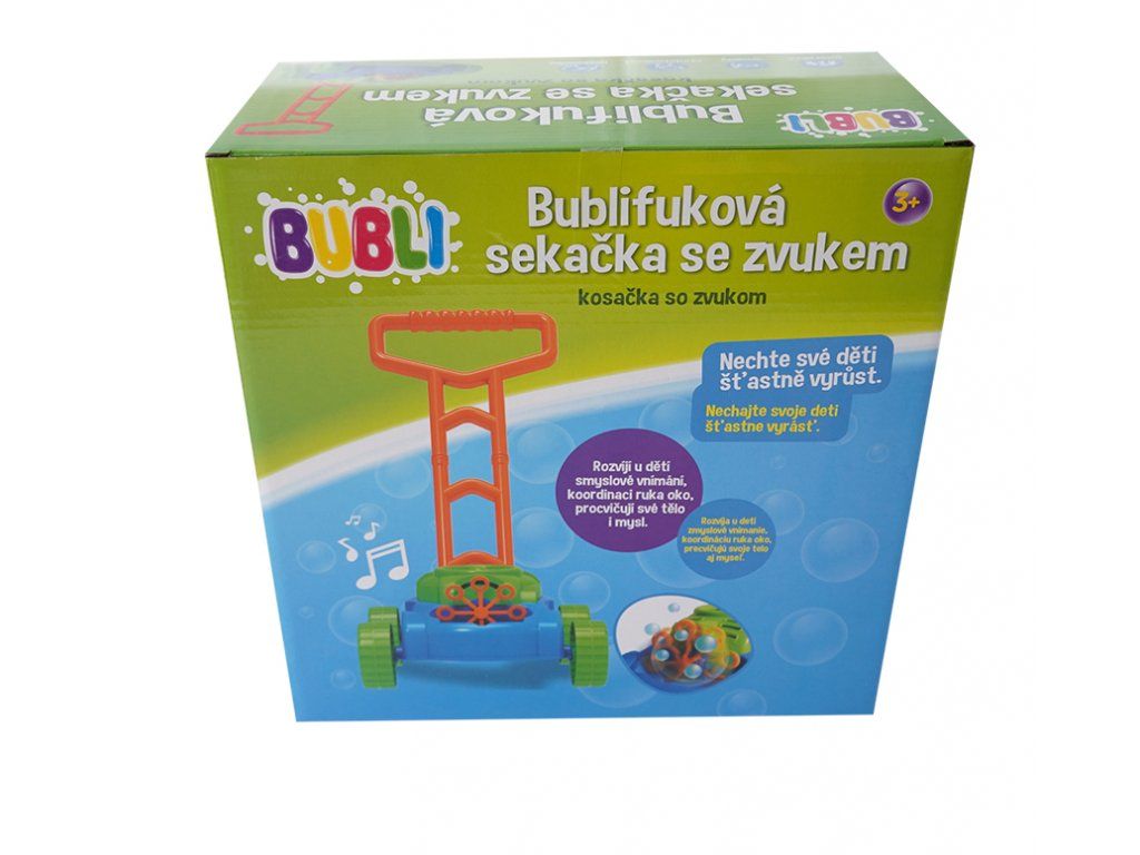 Zábava na záhrade nikdy nebola taká ľahká a bublinková! Záplava bublín bez námahy. Namiesto klasického žacieho ústrojenstva má táto kosačka špeciálny mechanizmus na výrobu bublín. Z kosačky sa pri jazde valí nepretržitý prúd bublín. Pri jazde kosačka hrá veselú detskú melódiu, čo ešte zvyšuje atraktivitu hračky a motivuje deti k pohybu. Je ideálny na záhradu, terasu alebo na prechádzky po rovných cestách.Dodatočné parametre