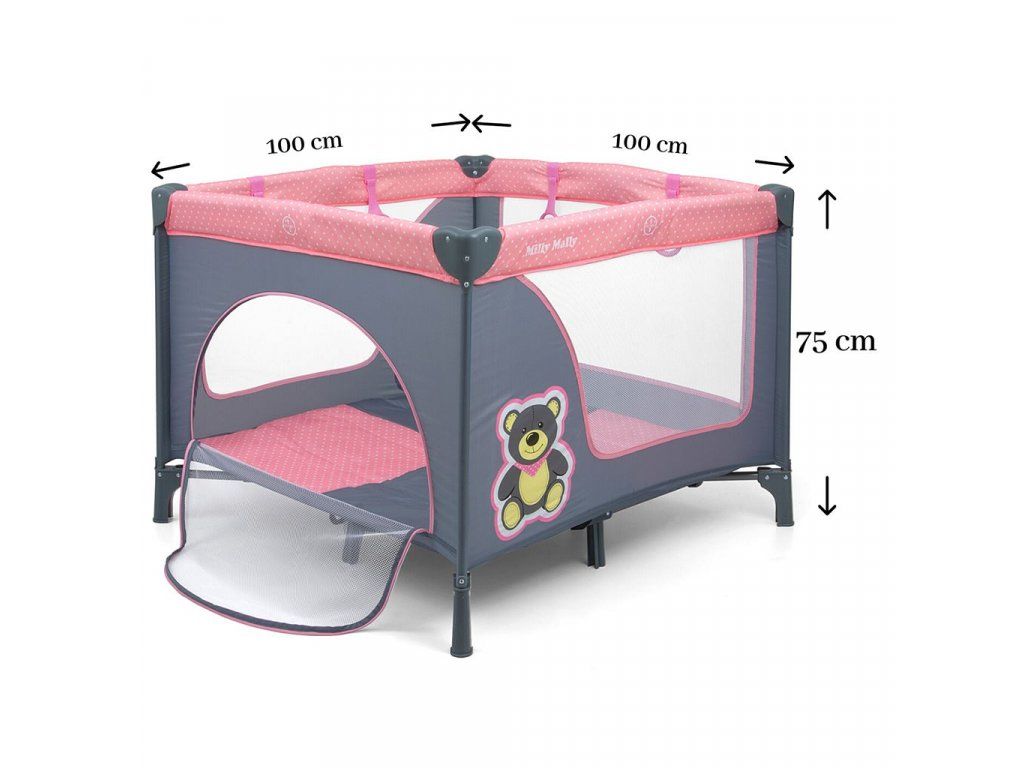 Detská skladacia ohrádka Milly Mally Fun. Ohrádka je ideálnou kombináciou postieľky a miesta pre hranie. Jednoduché a rýchle skladanie ako v cestovnej postieľky. Priehľadná sieťka na bočných stranách umožňuje dieťaťu sledovať okolie a krásne a farebné vzory dieťa zaujmú. Jeden bok má otváracie dvierka na zips. Ohrádka má mäkkú farebnú matrac. Súčasťou je tiež taška na prenášanie.