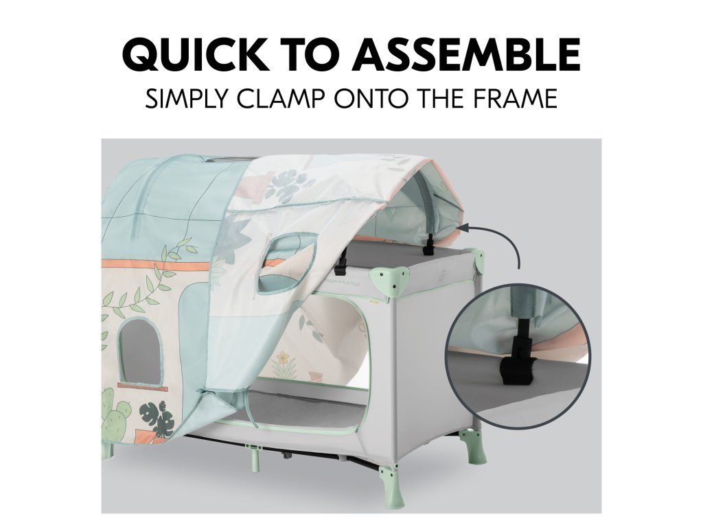 NASADENÝ POČAS CHVÍĽKY // Úplne bez použitia náradia: stan jednoducho nasadíte a pripevníte na rám svojej cestovnej postieľky a rovnako rýchlo ho opäť zložíte.