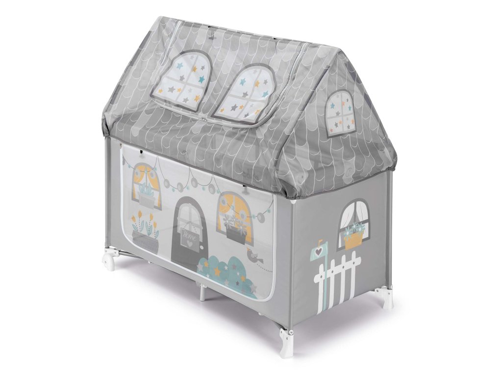 Ďalší prístup k dieťaťu je cez striešku domčeka, ktorá sa dá zrolovať. Vnútri postieľky je mäkký, pohodlný matrac. Pre najmenšie bábätká, ktoré ešte ležia, možno spodok postieľky zdvihnúť do polovice. Domček na hranie je priestranný a po stranách má dve veľké vrecká, do ktorých možno uložiť hračky alebo iné detské vybavenie.