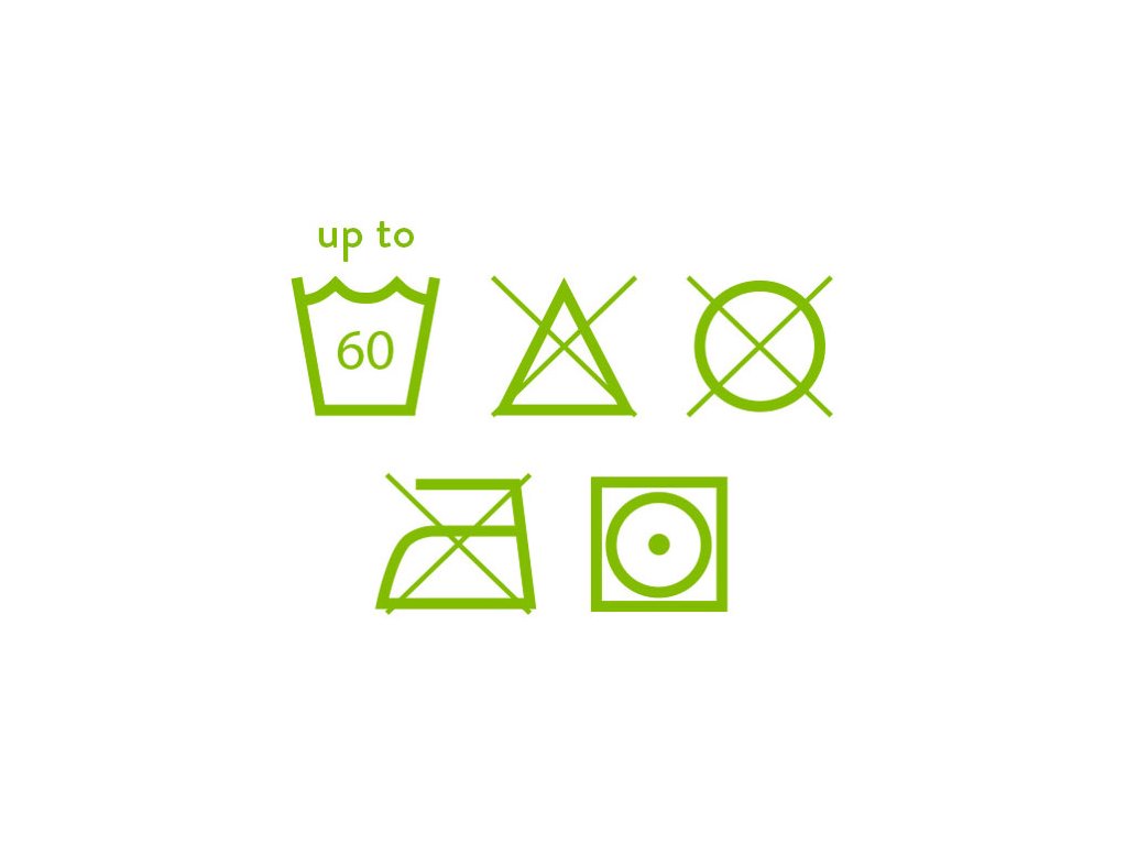 Návod na ošetrenie: perte v práčke na max . 60 ° C . Nepoužívajte chlórové bielidlá. Nepoužívajte aviváž . Môže sa sušiť v bubnovej sušičke pri nízkej teplote . Nežehlite . Nečistite chemicky .