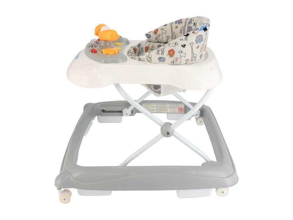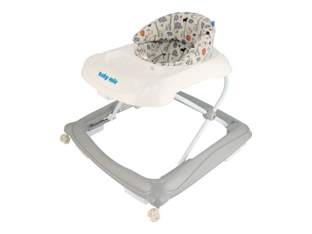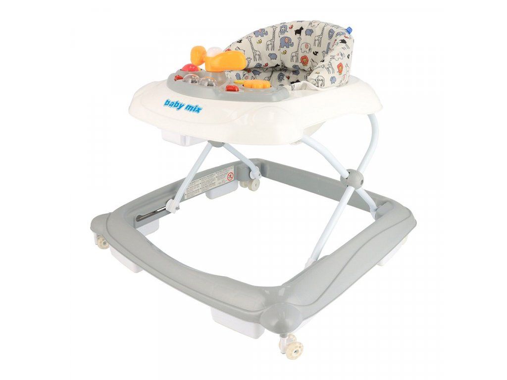 Multimediálne chodítko Baby Mix so silikónovými kolieskami. Chodítko je vybavené pohodlným ergonomicky tvarovaným sedadlom, ktoré zaisťuje správne držanie chrbtice. Multimediálny panel obsahuje rôzne svetelné efekty, trúbiaci volant, ktorým možno otáčať, tlačidlá pre prehrávanie melódií a dve svetlá. Krásne chodítko s hračkami očarí malých objaviteľov a umožní im hrať sa ešte dlhšie. Chodítko je vybavené špeciálnym systémom proti prevráteniu, ktorý zaistí Vášmu dieťaťu pohodlie a bezpečnosť.