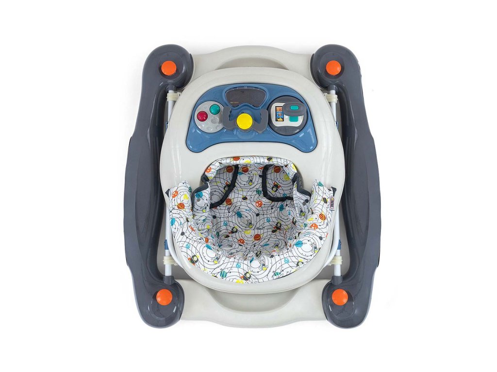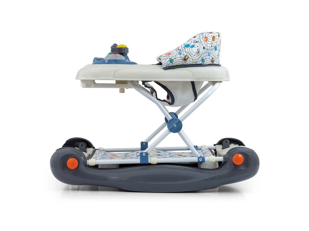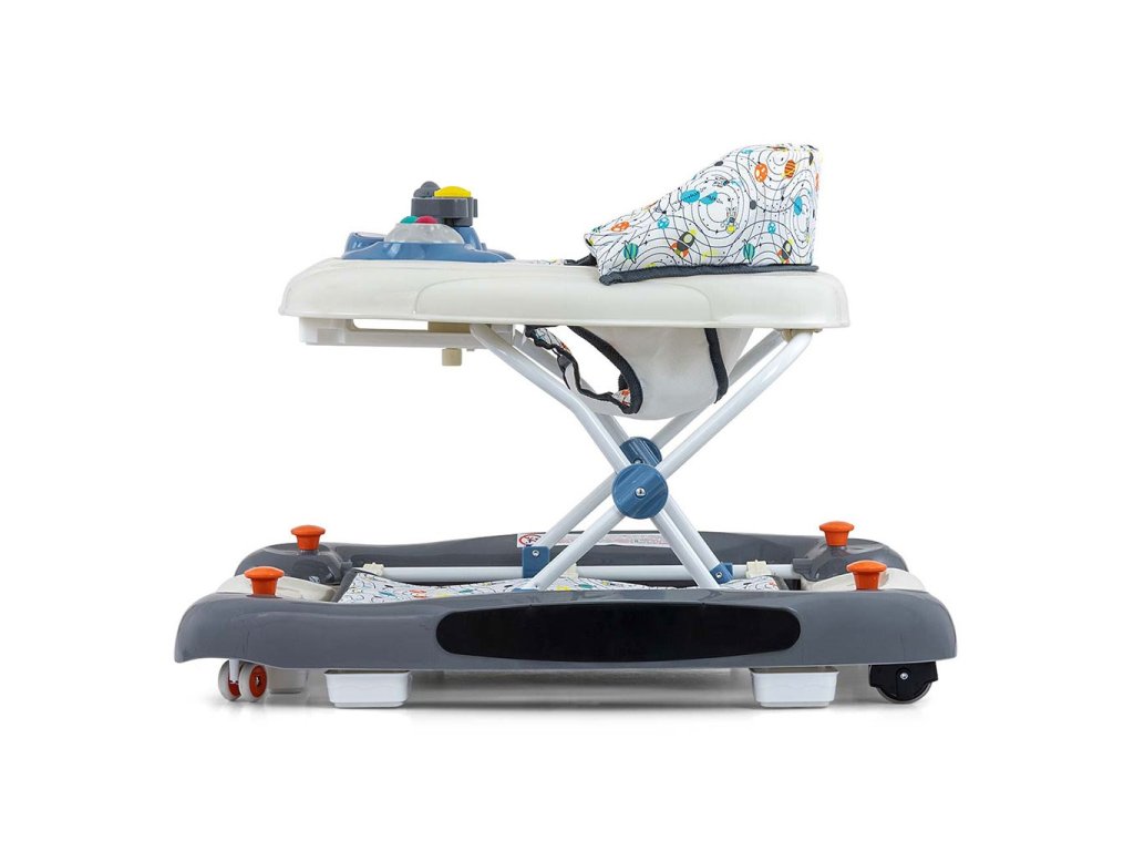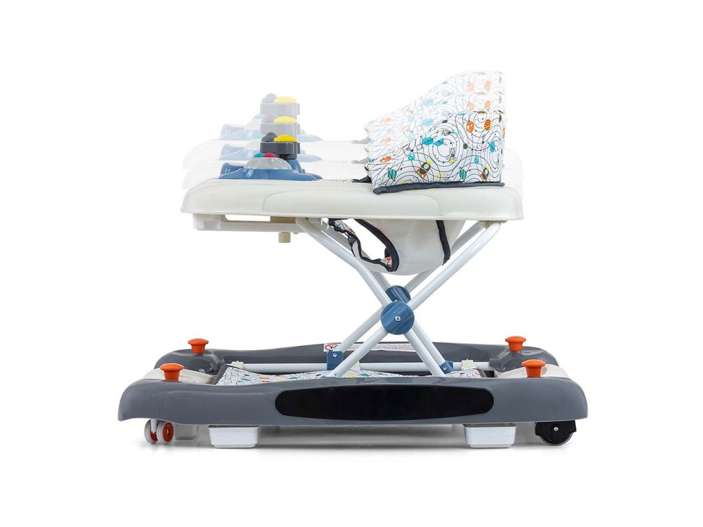 Chodítko PATROL Plus má štyri kvalitné kolieska, 2 predné kolieska sú otočné a 2 zadné kolieska sú pevné. Tieto kolieska nepoškriabu povrch podlahy, pretože majú ochranné gumové kolieska, ktoré zabezpečujú voľnosť pohybu, a šesť gumových zarážok chráni dieťa pred pošmyknutím zo schodov alebo iných prekážok. Po zložení zaberá chodítko veľmi málo miesta - pohodlné skladovanie.